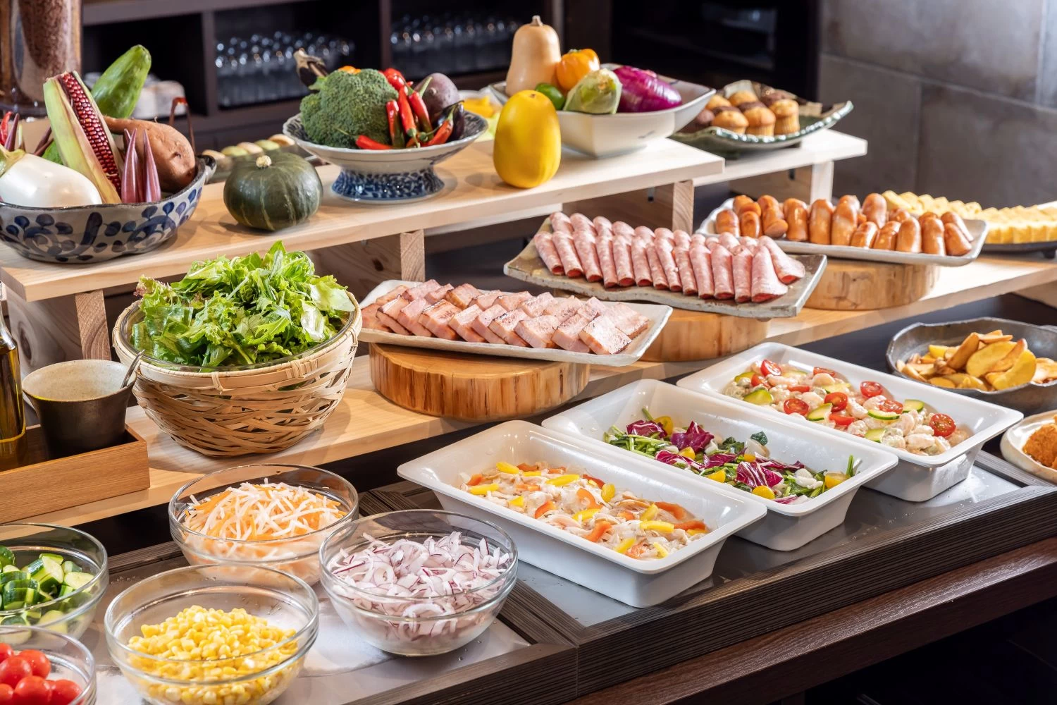 - ★ メインのお料理をテーブルでオーダーし、サラダやパン、おばんざい、ごはん、お味噌汁などはブッフェテーブルからお好きなだけいただきます