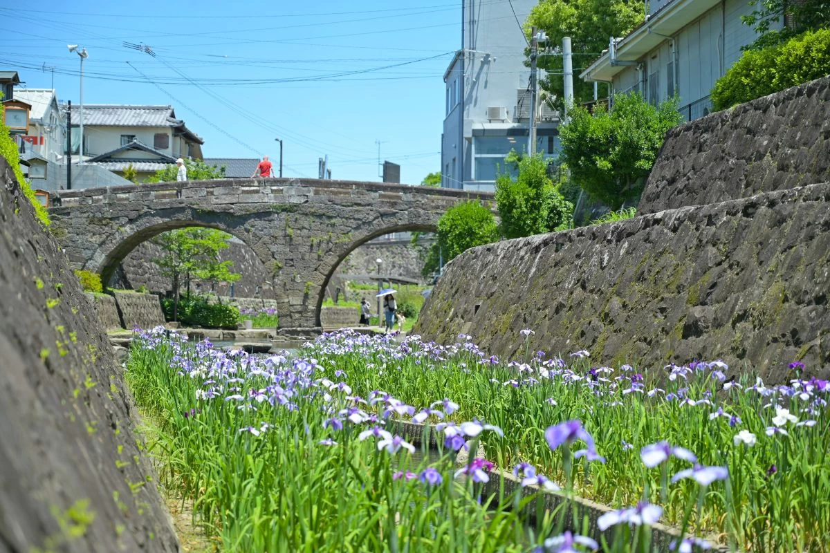 - ★ 1848年(嘉永元年)に築造された県指定文化財「高瀬眼鏡橋」をはじめ、石橋や高瀬商人が競い合って築いた石垣の家々など、歴史情緒あふれる公園です。例年5月下旬から6月上旬には、川沿い約700mに花しょうぶが咲き誇り、多くの人でにぎわいます。散策しながらゆったりと過ごしてみてはいかがでしょうか