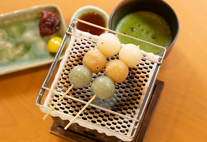 - ★ 外湯めぐりの際に気軽に立ち寄れる和カフェでひと休み。店の自慢は、厳選食材を使用した手作りの和スイーツです。なかでも人気の「あぶりだんご」は、手元に運ばれたミニ七輪でおだんごを自分で炙り、好みの焦げ目を付けて味わえます