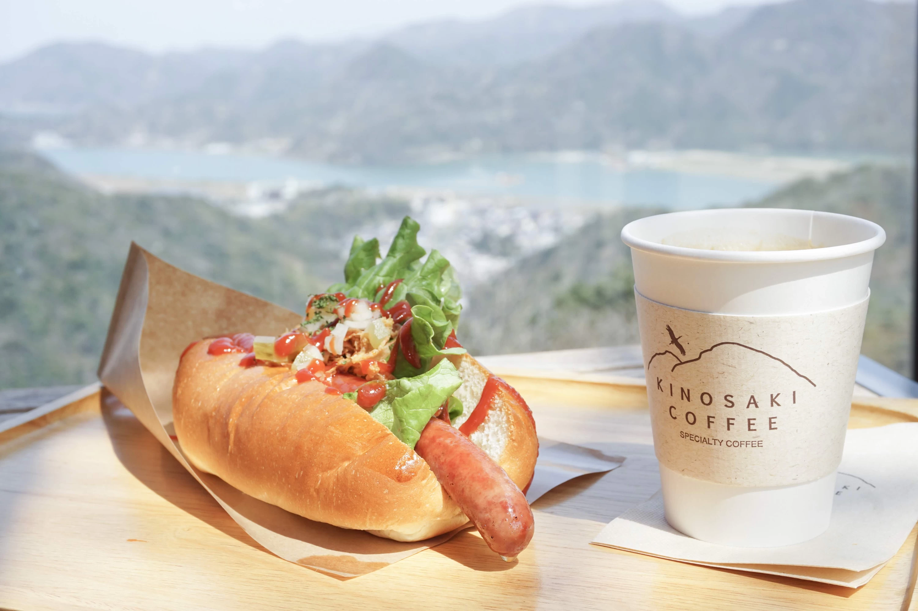- ★ 城崎温泉を一望する大師山山頂にある絶景カフェ。自家焙煎のスペシャルティコーヒーや但馬牛・但馬鴨・八鹿豚を使用したオリジナルソーセージのホットドッグを味わいながら、山頂の風と景色を満喫できます