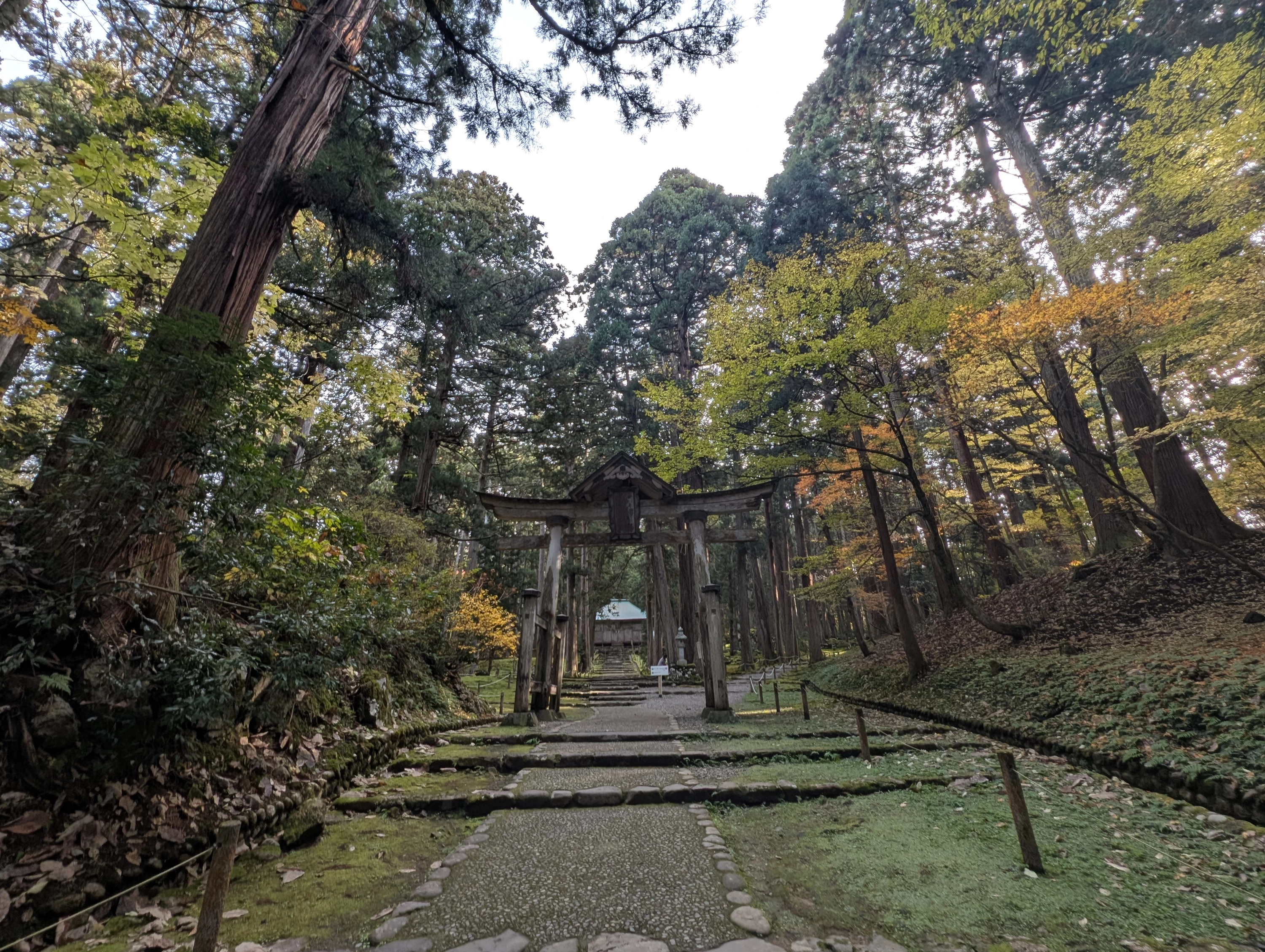 717年に泰澄大師により創建。かつて白山信仰の重要な拠点として栄えた歴史ある神社で、「白山平泉寺」として知られていた。広大な境内は美しい苔に覆われ「福井の苔寺」とも呼ばれている。創建以来、比叡山延暦寺の末寺として栄え、最盛期には48の神社、36の寺院、6,000の坊院に約8,000人の僧兵が活動する巨大な宗教都市となった。