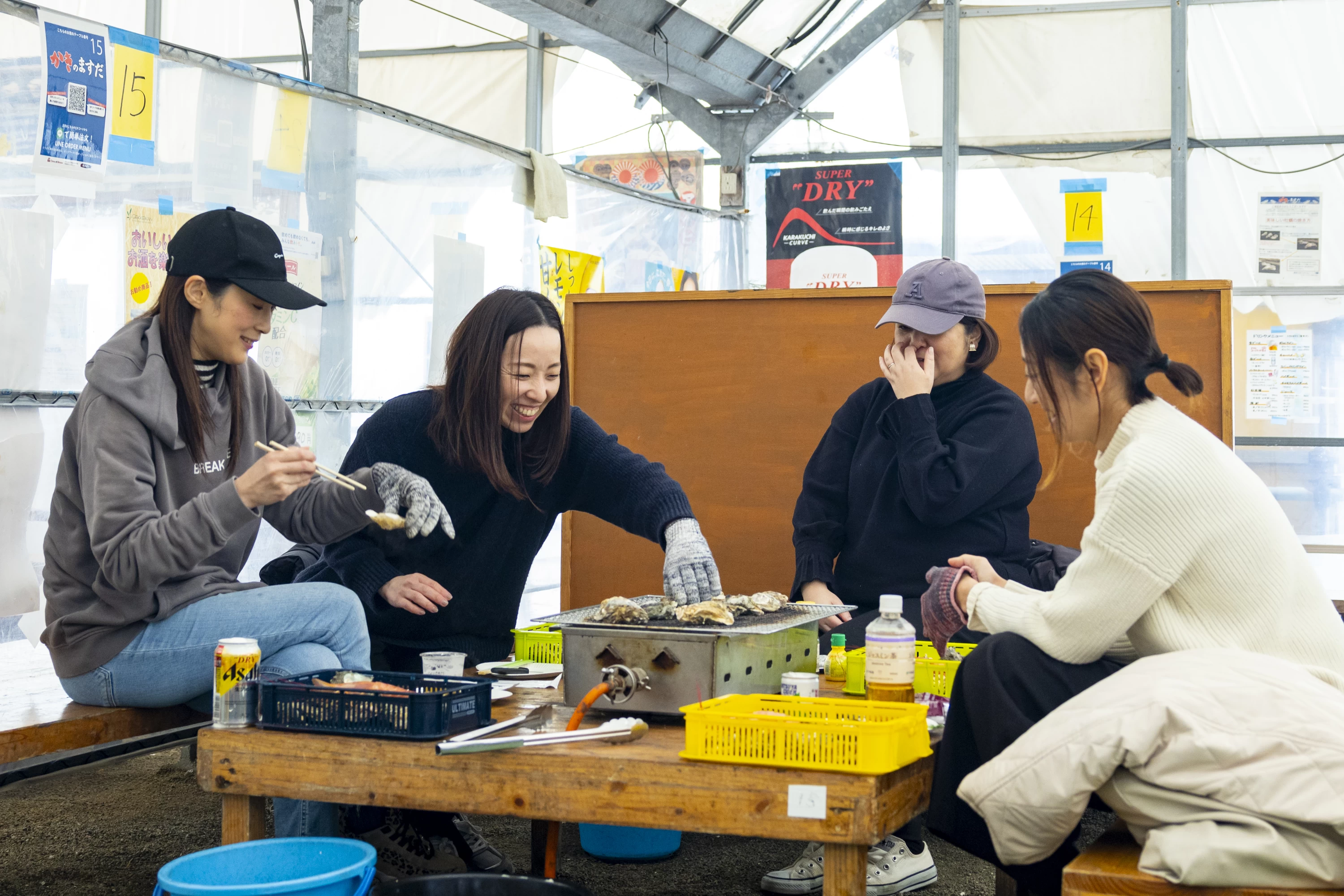 今や福岡県民にとって牡蛎は「冬の風物詩」。岐志漁港には10軒以上(多い時期で13軒)もの牡蛎小屋が軒を連ね、糸島半島のなかでも最大のエリアとなっている。セルフバーベキュー方式が基本のシステム。