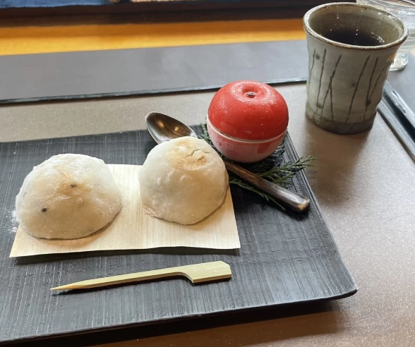 - ★ 石段街の麓から、道路を挟んだ向かい側にある甘味処です。自家製のお餅を使った手作り「あがり餅」や、りんごジェラートは自慢の逸品。持ち帰りもできるので、宿でゆっくり食べるのもいいですね