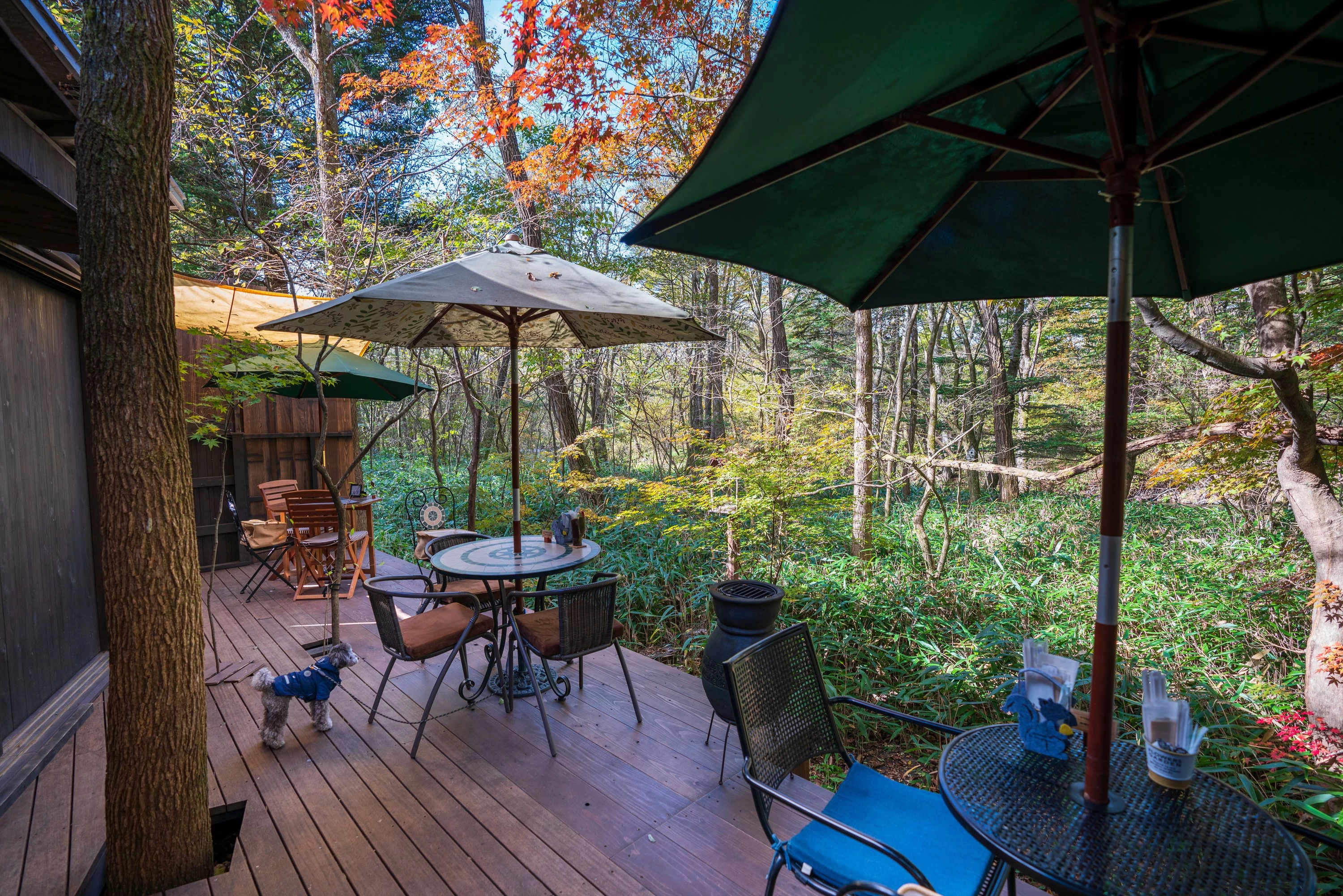 - ★ テラス席では愛犬と一緒に食事を楽しめます。春〜秋はモミジの葉がテラスを優しく覆い、心地よい雰囲気に。軽井沢の風を感じながら、ゆったりとした時間をお楽しみください