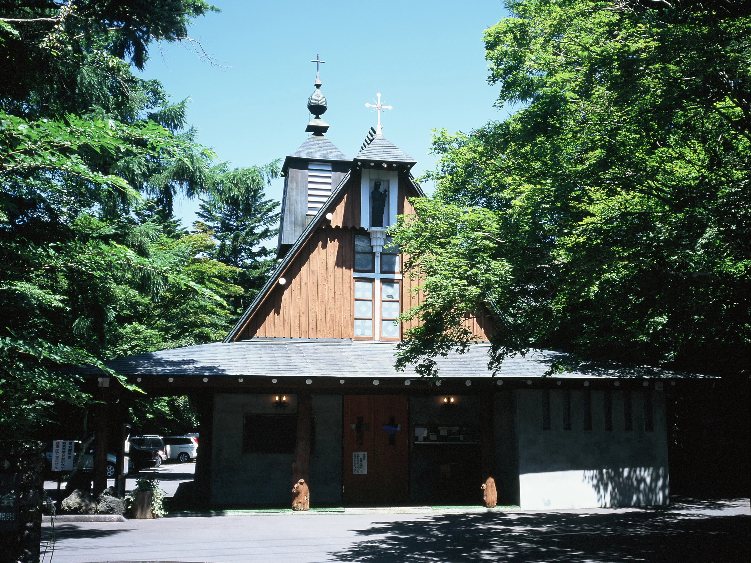 - ★ 1935年、英国人レオ・ウォード神父の願いにより創建された軽井沢唯一のカトリック教会。チェコ出身の建築家アントニン・レーモンドが手がけた三角屋根と尖塔が特徴。木造の開放的な内部には、高い天井とぬくもりのある空間が広がります。川端康成や堀辰雄の作品にも登場したスポットです