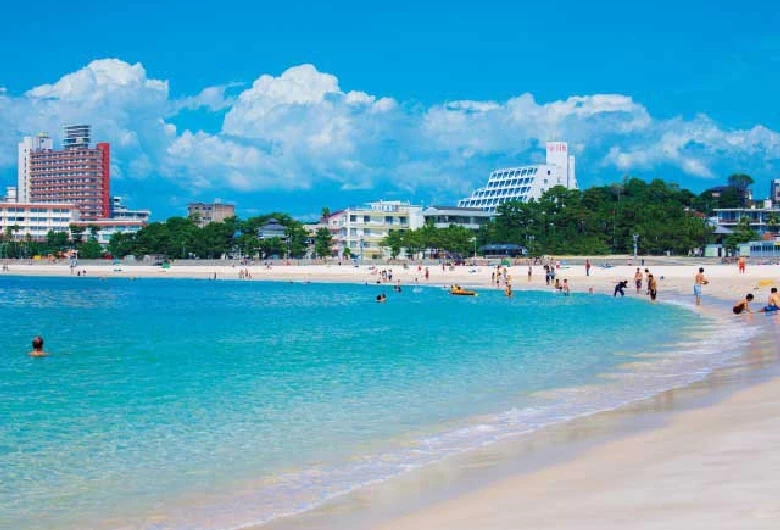 長さ640mにわたる白砂の海岸は、関西を代表する海水浴場のひとつ。海岸には水着着用で入る露天風呂があり、美しい海岸を見ながら名湯白浜温泉の湯を満喫できる。