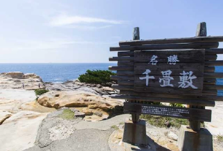 第三紀層の砂岩が長い年月の間に波によって浸食されてできた岩畳が、青い海に迫り出し広がっている。広大な岩畳が茜色に染まる落日の頃の美しさで知られる。