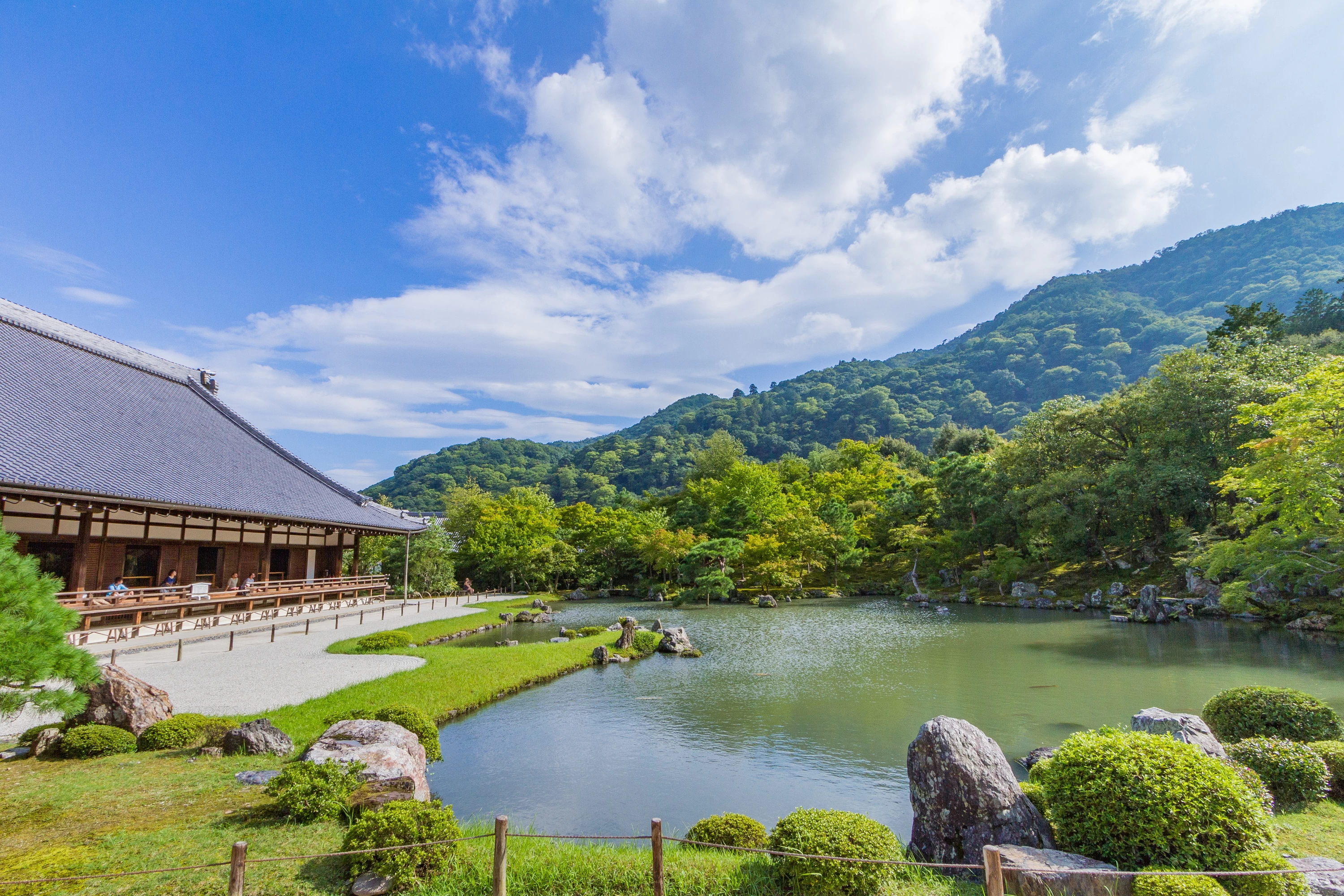 京都・嵯峨嵐山にある臨済宗天龍寺派の大本山で、境内には歴史と禅の精神が息づく多彩な建物と庭園が整えられている。法堂には加山又造画伯による天井画・雲龍図があり、説法の場としての存在感を放つ。曹源池庭園は夢窓国師の作庭当初の姿を色濃く残す池泉回遊式庭園として、日本初の史跡・特別名勝に指定。嵐山・亀山・小倉山を借景にした四季の風景美を楽しめる。