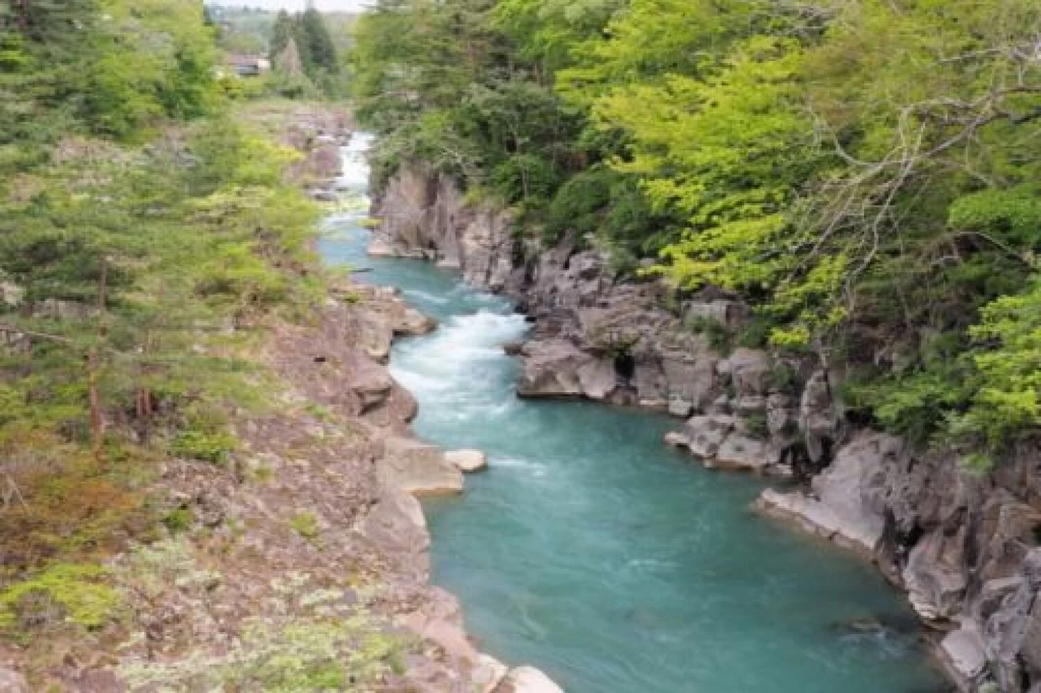 - ★ 遊歩道を散策すると、つり橋から上流の荒々しい流れと下流のゆったりとした淵の対照的な景色が見られます。岩肌とエメラルドグリーンの水流、四季が奏でる美しい景色は、国の名勝天然記念物に指定されています