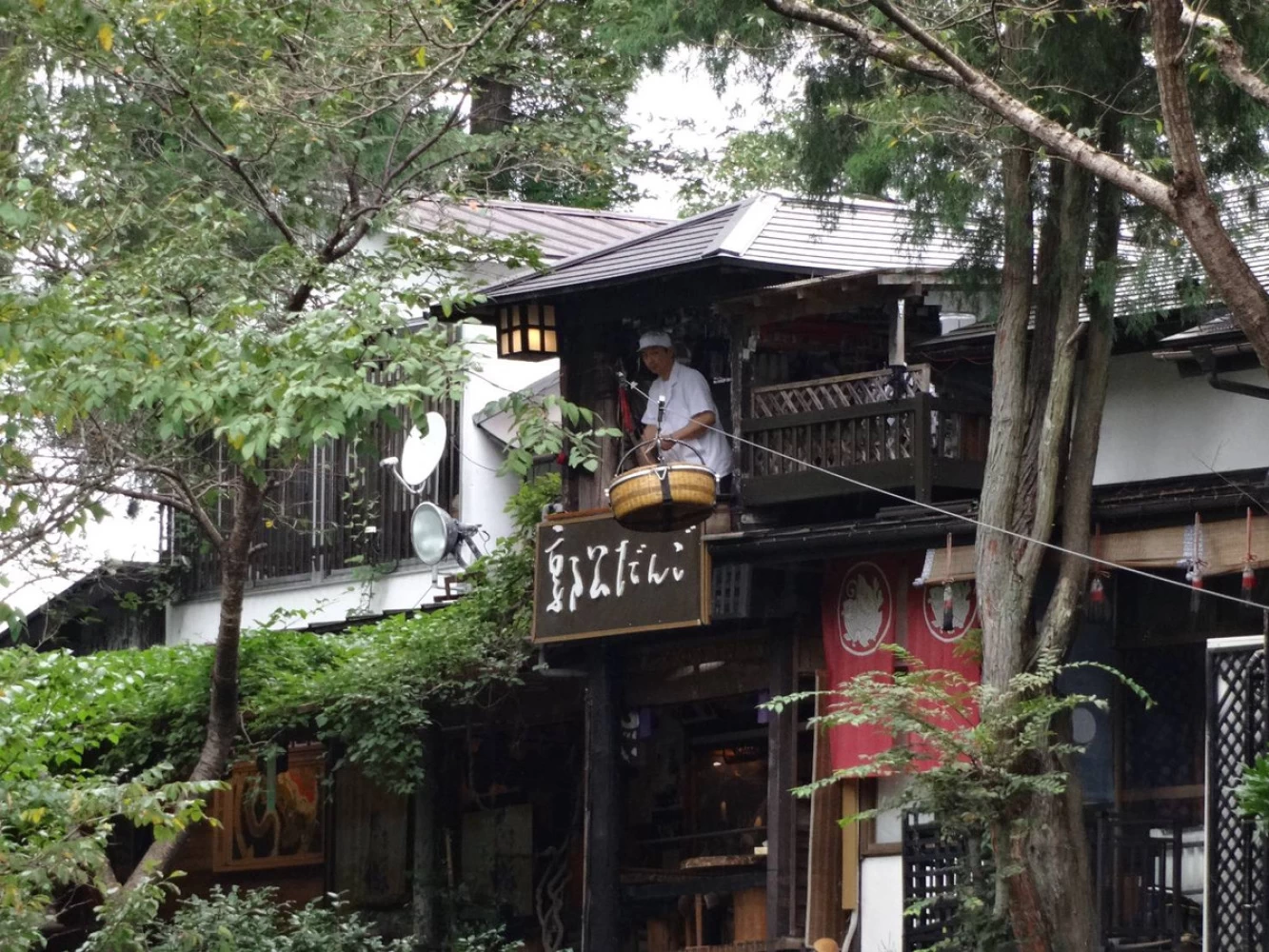 - ★ 厳美渓名物「空飛ぶだんご」はご存知ですか? 渓流を挟んだ対岸にあるお店とつながれたロープにぶら下がっているカゴに注文書と代金を入れ、木槌で板をたたくと店員さんが応答。そのカゴの中にお団子やお茶を戻してくれます。ちょっとしたアクティビティとして楽しんでみましょう