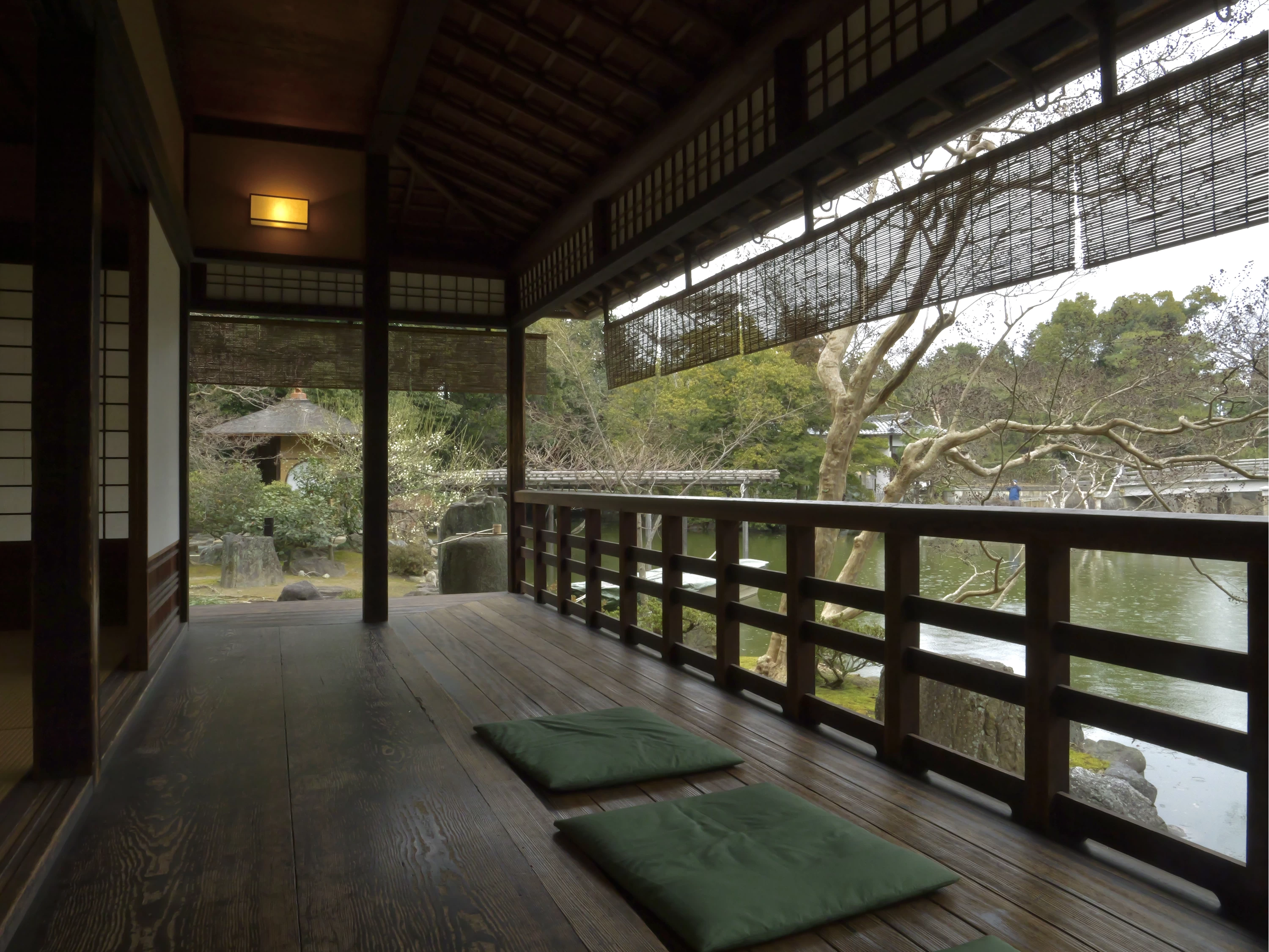 約200年前の江戸時代後期に建てられた、五摂家のひとつである「九條家」の茶室と伝わる建物。往時は主に、茶会のための離れとして使用されていた。全体は数寄屋風書院造りで、2階部からは九條池や高倉橋を見渡すことができる。