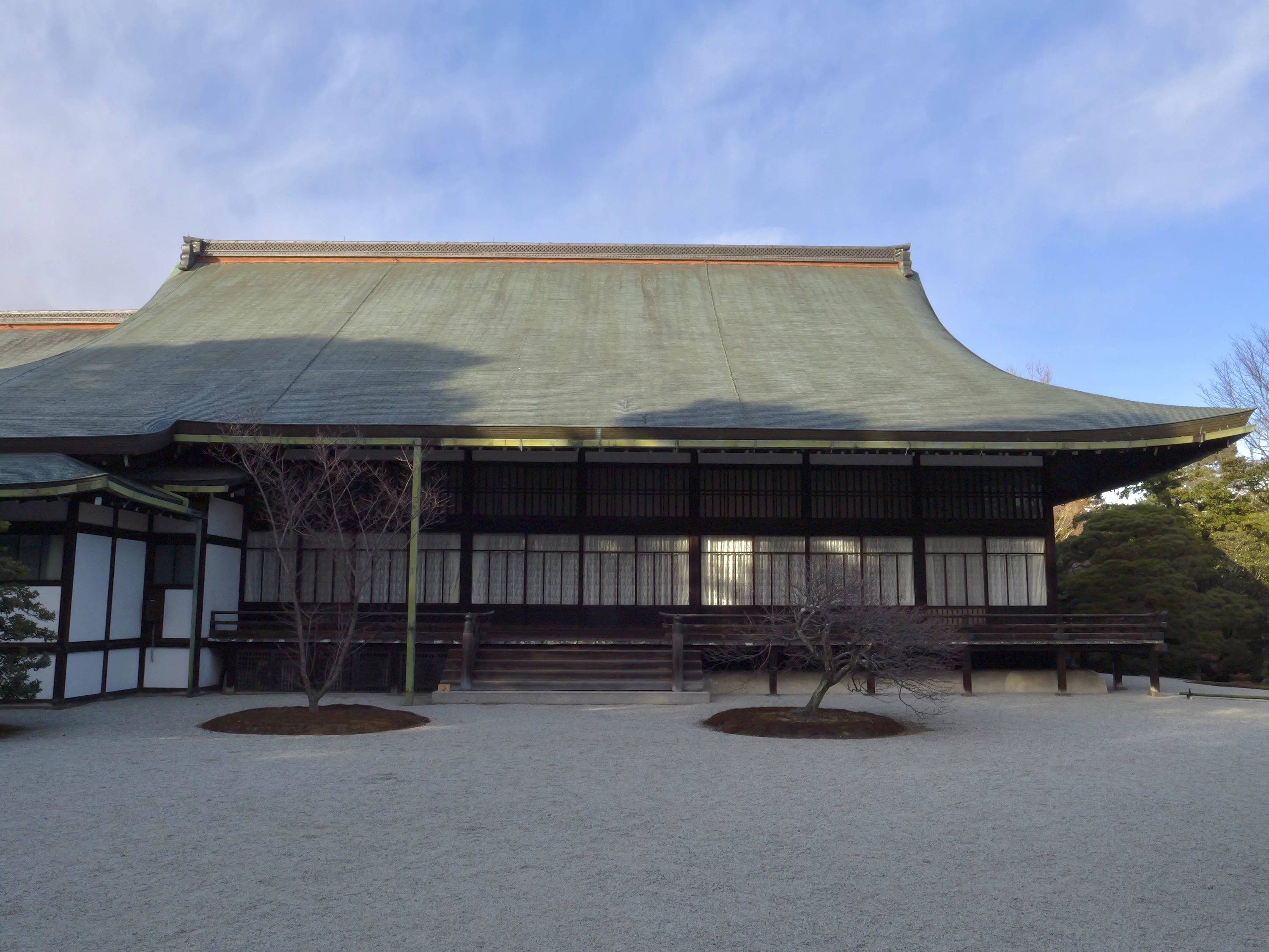 - ★ 内裏の主要建物の中心たる「紫宸殿(ししんでん)」。宮廷の重要な儀式が執り行われた場所で、かつて内裏の正殿であった建物です。隣接する「清涼殿」とともに、建築様式は寝殿造を基調としており、柱が全て円柱であったり、内部は畳を敷かない板敷の広い空間であるなど、平安時代の様式を今に伝えています