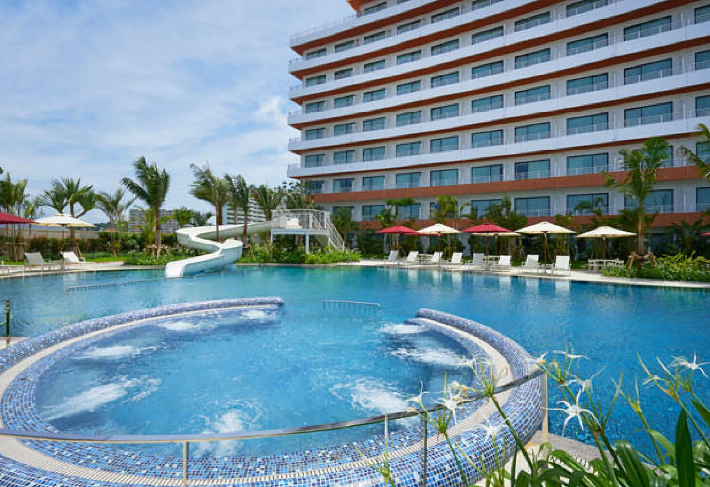 那覇空港から車で約45分の本島中部に位置する、アーバンリゾートホテル。琉球石灰岩をはじめ琉球ガラスなど、沖縄特有の素材を活かした建物が特長で、客室からは北谷の海や街並みを一望することができる。