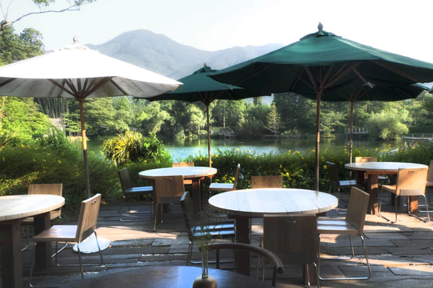 - ★ カフェのテラス席では、金鱗湖を間近に眺めながら食事が楽しめますよ。天然酵母の自家製クロワッサンとコーヒーは、おすすめの一品