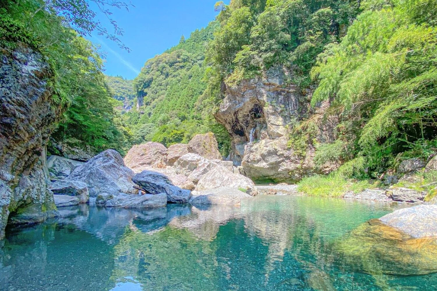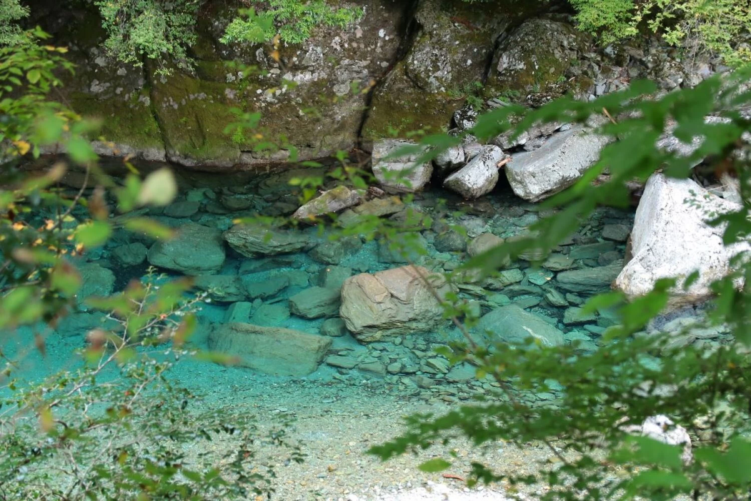 - ★ 中津渓谷より観光地化されていない印象ですが、その野趣にグッとくるはず。岩々から浸み出る水の青さに、思わず見入ってしまいます