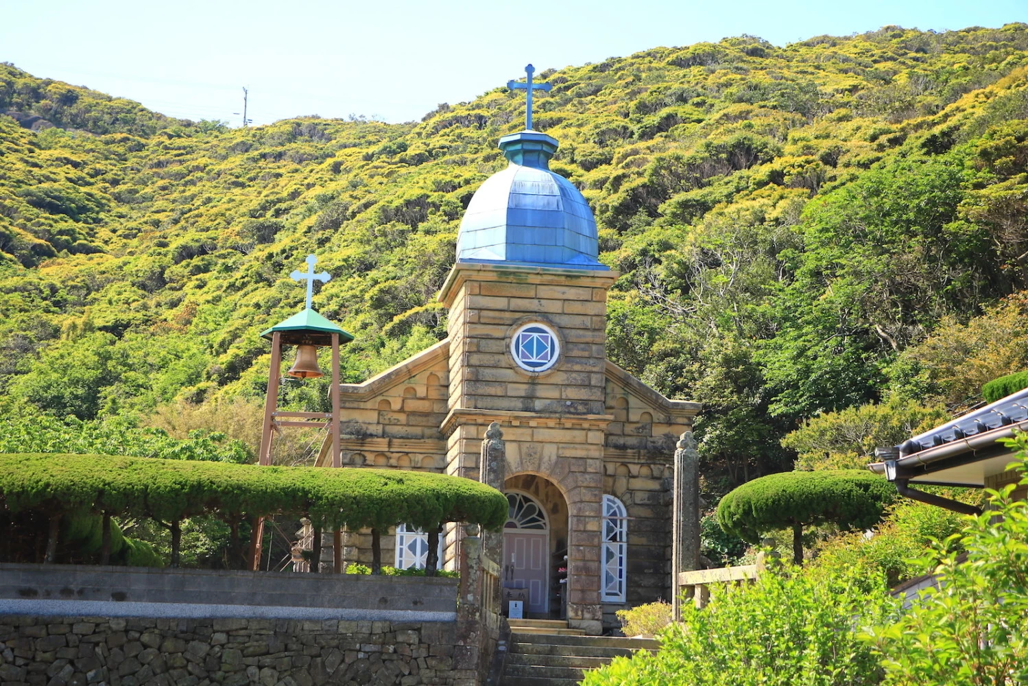 中通島の北東、頭ヶ島にある石造りの天主堂。2018年、世界遺産に登録された「長崎と天草地方の潜伏キリシタン関連遺産」の構成資産の一つ。キリシタン墓地や石垣・石段など周辺景観も良好に保たれており、文化財として評価が高い。