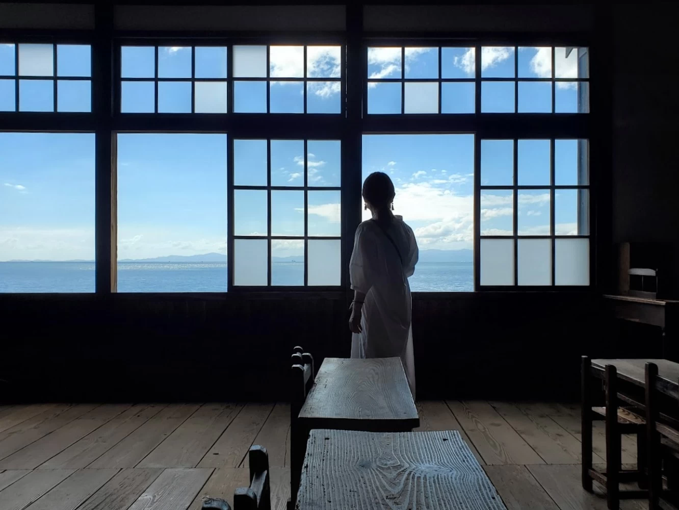 - ★ 「岬の分教場」を模写して造ったロケ用の「木造校舎」からは、瀬戸内海を望む絶景が。教室で出席をとったり、廊下を雑巾がけしたりと昭和初期の懐かしい学校シーンの撮影ができます。ご家族みんなで、いろんなシーンにトライしてみて!