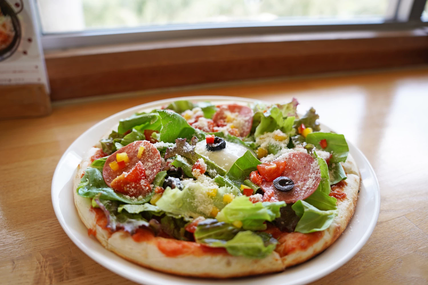 - ★ 人気メニューの「サラダピザ」は、自家製トマトソースで焼き上げた生地に、たっぷりのフレッシュ野菜やボロニアソーセージをトッピング、小豆島オリーブ公園産オリーブオイルふんだんに回しかけた絶品ピザです
