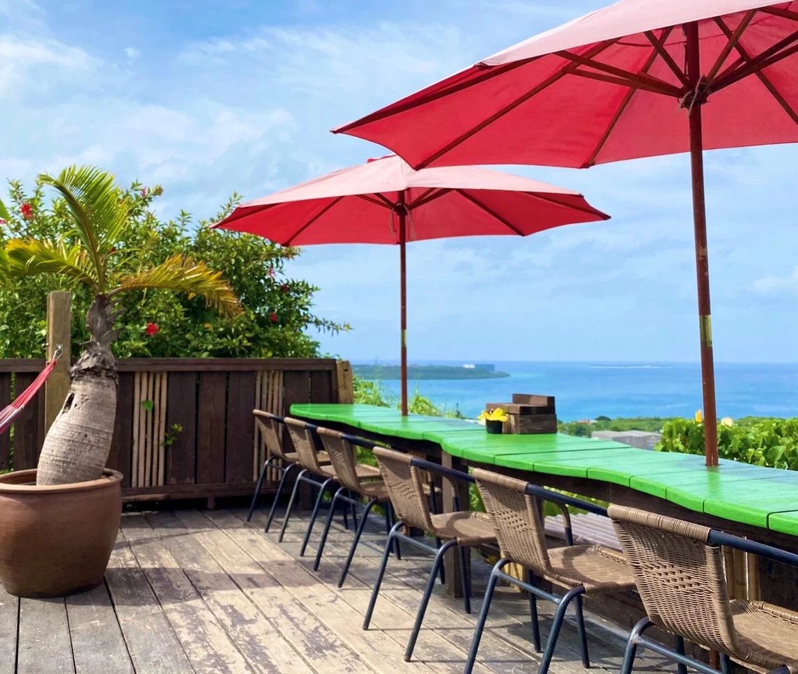 - ★ 店内はオーシャンビュー。南国リゾートを思わせるお店の作りが特徴です。テラスには、ヤシの葉の屋根が付いた東屋風のデッキが並び、板の間に座ってくつろいだり、ハンモックに揺られてまどろんだり。海を眺めながら、思い思いにのんびり過ごせますよ