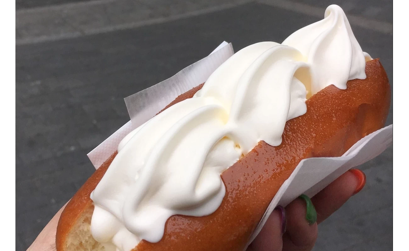 食べ歩きの〆には“西の原宿”と呼ばれるアメリカ村での「アイスドッグ」はいかがでしょうか? 揚げパンの間にあふれんばかりのソフトクリームが挟まっていて、ボリューム満点。見た目よりも軽くペロリと完食できるのが特徴です。