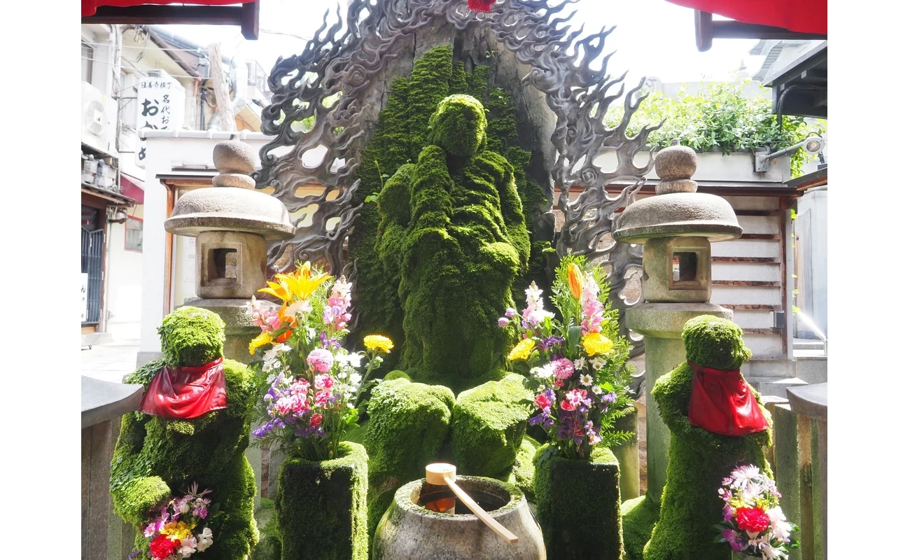 “苔”にスポットを当てた、ちょっと変わり種のプランで暇つぶしをするならこちら。最初に訪れる「法善寺」では、苔生す不動明王と童子像2体に出会えます。願かけのために水をかけていたことから、像が苔生して現在の姿になったのだとか。ほかではなかなか見られない圧巻の像は、一見の価値あり!