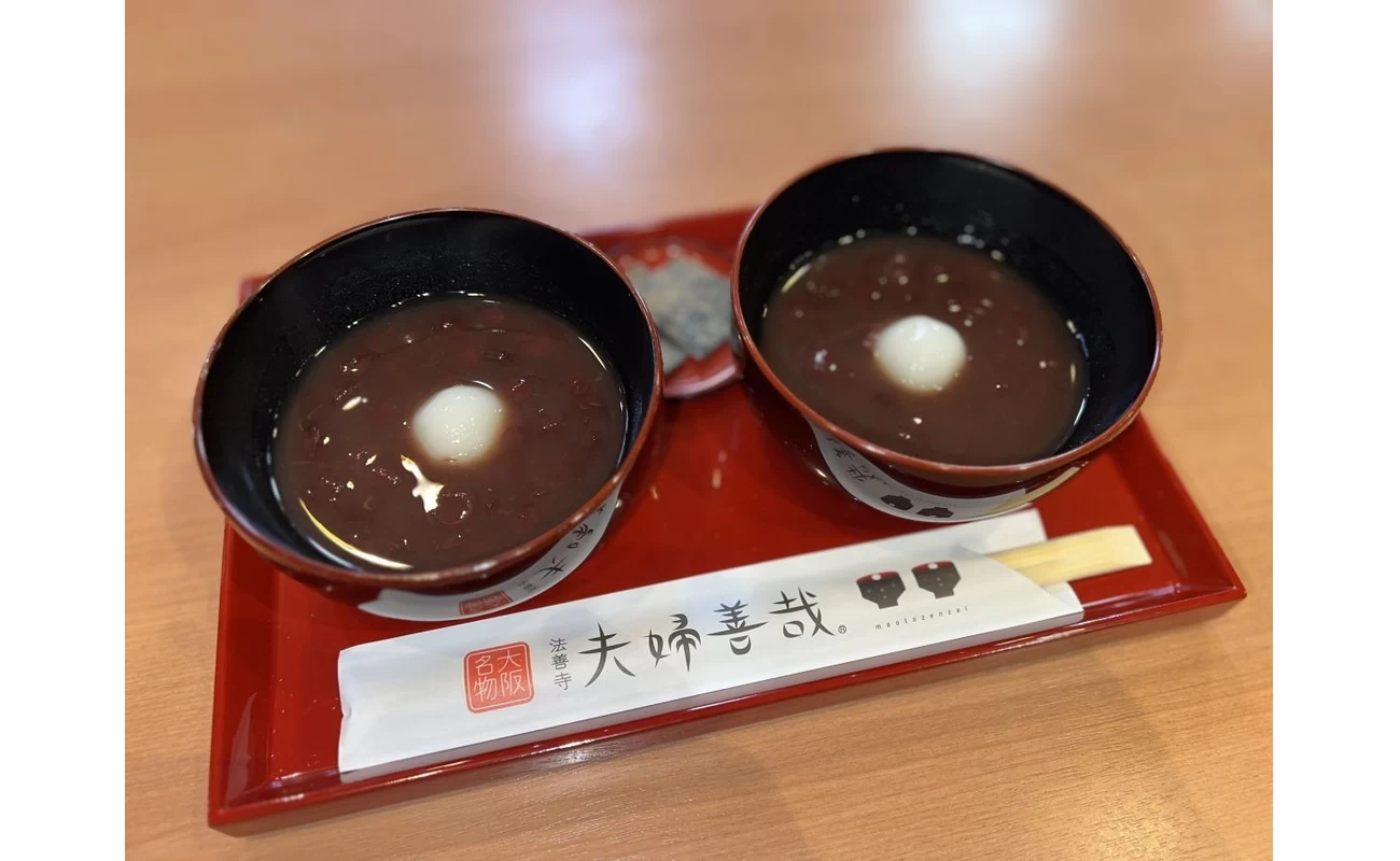 参拝後は、「法善寺 夫婦善哉」でひと休みしましょう。明治時代に創業した老舗の甘味処で、小説「夫婦善哉」の舞台としても名が知られています。1人前のぜんざいを2つの椀に分けて提供されるのが特徴です。