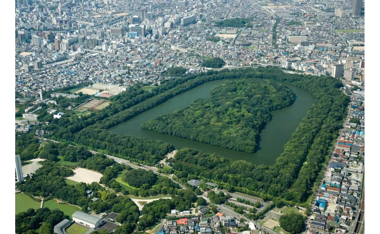 グルメを挟みながら、堺で歴史を堪能するプランならこちら。1日で10スポットを巡る充実の旅となっています。最初に訪れるのは、日本に点在する古墳のなかでも特に美しいと評される「ニサンザイ古墳」。古墳と聞くとまずイメージする鍵穴型の「前方後円墳」のひとつです。