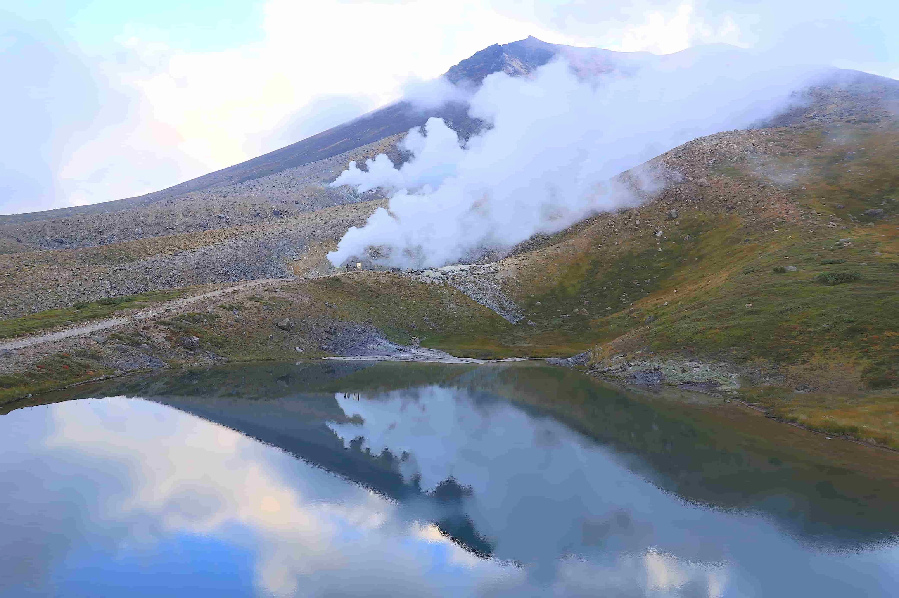 夏は涼風が心地よく、チングルマをはじめとする高山植物が足元を彩ります。9月中旬には森林限界付近のナナカマドやダケカンバが色づき、本州よりも早い紅葉が広がります。噴煙を上げる旭岳の姿が池に映り込む光景は、北海道らしい自然のスケールを感じさせてくれます。