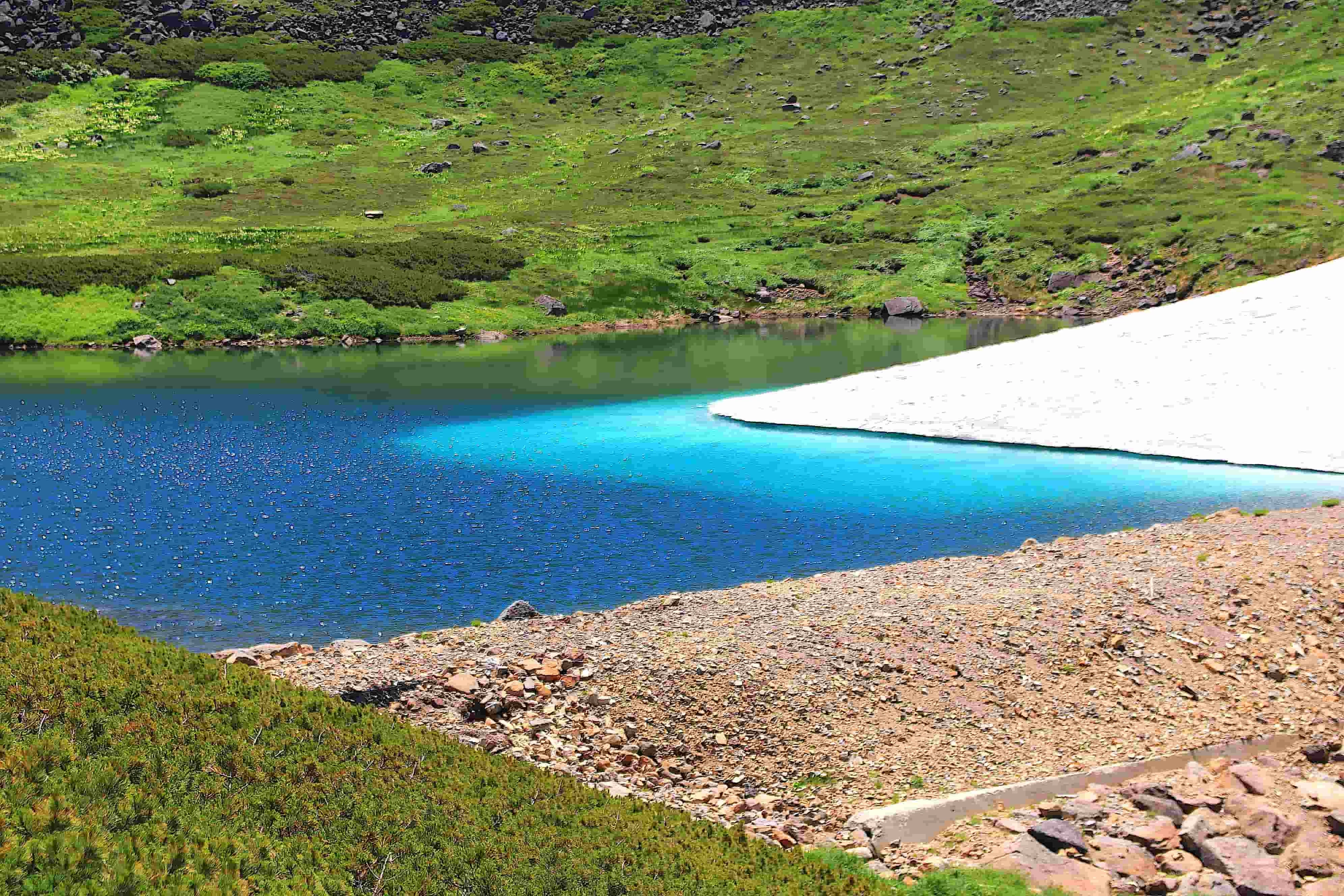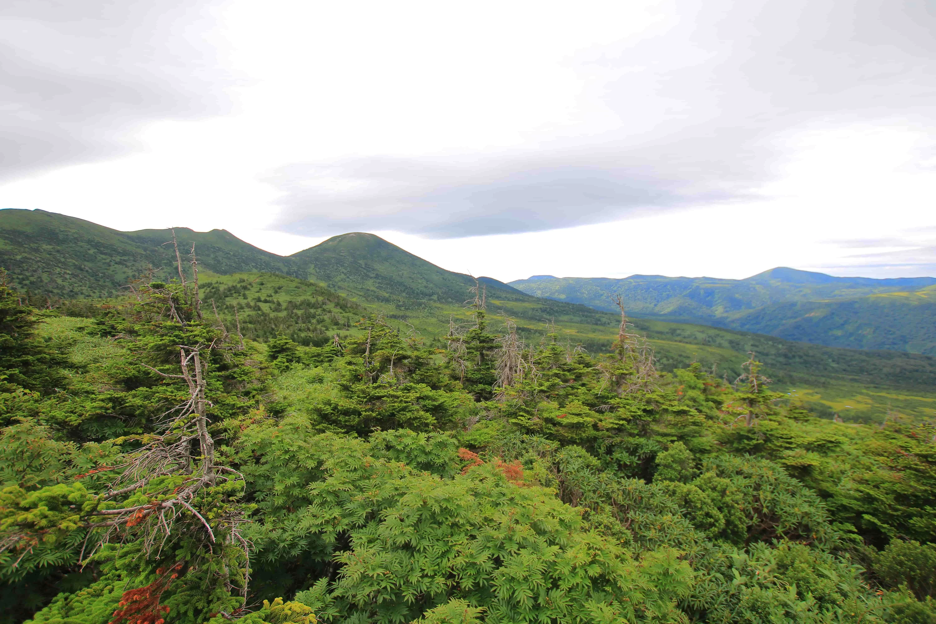 標高1,400mを超えるとハイマツ帯が広がり、森林限界の風景が目の前に現れます。窪地には湿原が点在し、多様な高山植物が咲き誇ります。大岳までは往復約4時間。標高差も比較的緩やかで、天候に恵まれれば津軽半島や下北半島、さらに津軽海峡越しに北海道まで望めます。