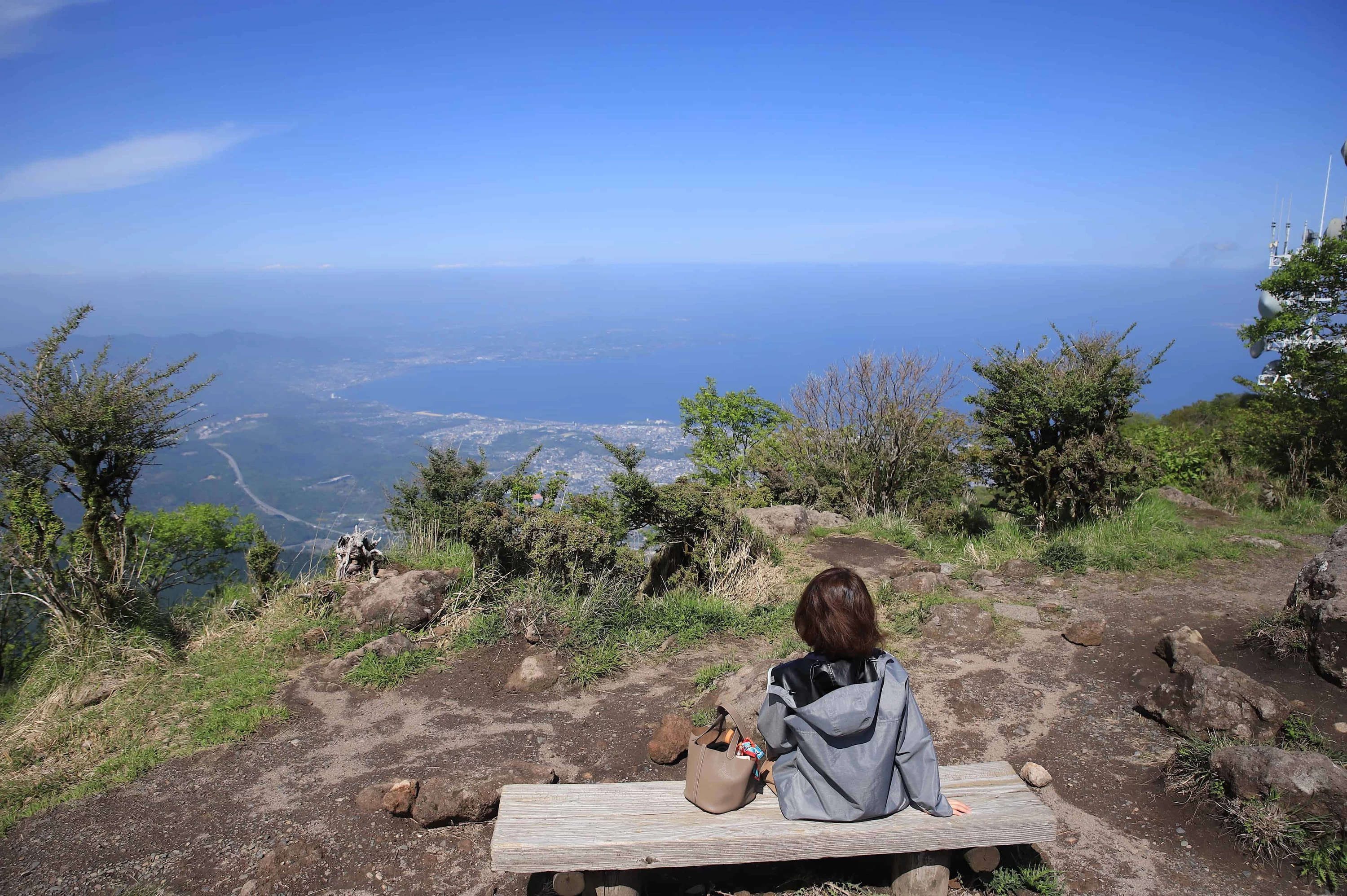 山頂からは別府湾や由布岳を望む大パノラマが広がります。5月から6月にかけてはミヤマキリシマが咲き誇り、ピンクに染まる山肌と新緑のコントラストが鮮やか。澄み渡る日には、阿蘇方面まで遠く見渡せることもあります。