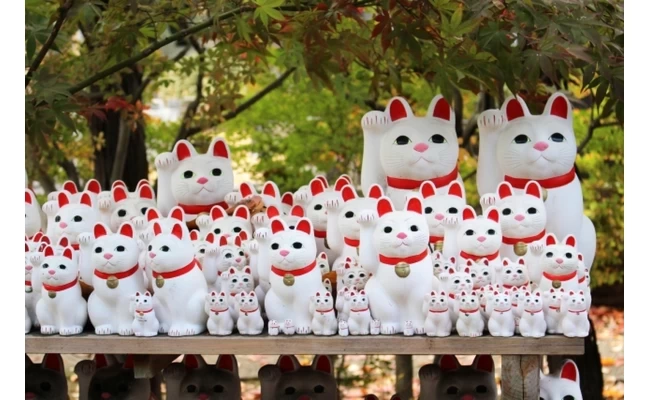 和菓子でひと休みしたら、招き猫発祥の地といわれる「大谿山(だいけいざん) 豪徳寺」へ。彦根藩主・井伊家の江戸の菩提寺で、井伊家ゆかりの文化財を数多く所蔵しています。世田谷区にありながら緑豊かな豪徳寺は、一人穏やかな時間を過ごしたいときにぴったり。招き猫をお祀りする「招福殿」には、大小さまざまな招福猫児(まねきねこ)がズラリと並びます。そのほか、「仏殿」や「三重塔」など見どころが多いので、じっくりと境内を散策してみてくださいね。