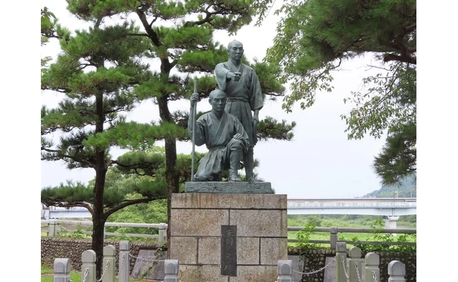 日本酒を購入したあとは、散策を再開! 玉川上水沿いを約25分歩き、視界が開けてきたら「玉川兄弟の像」が見えてきます。江戸の飲料水不足を解消すべく、多摩川から水を引く玉川上水路建設に大きな貢献をした玉川兄弟。その功績を称えるため、この地に銅像が建てられました。右側に立つのが兄の庄右衛門(しょうえもん)、左側で片膝を付いているのが弟の清右衛門(せいえもん)。庄右衛門の指さす方向には、河川から水を引き入れるための取水施設の一種である羽村取水堰(はむらしゅすいせき)があります。