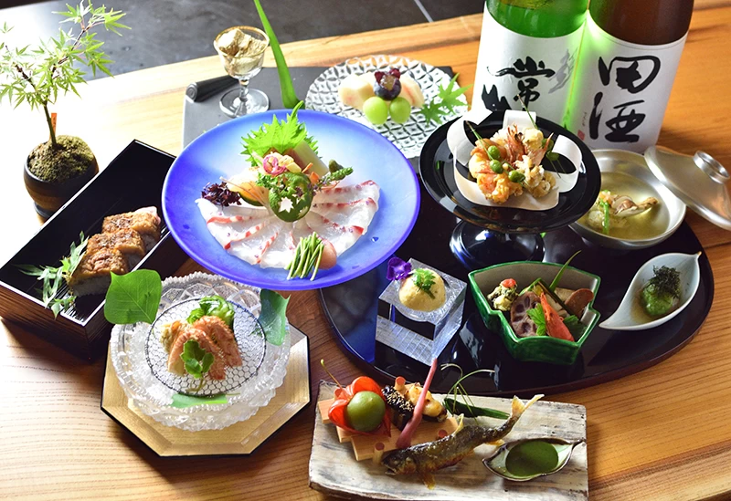 京都市・北大路の住宅街にある「葵献心 やま田」は、完全予約制の隠れ家的京料理店です。和食一筋35年以上の店主が手がける料理は、四季を映す芸術的な逸品ぞろい。夏季限定の「鮎の石庭盛り」は、漆板に塩で滝と清流を描いた繊細な盛り付けで知られています。白いのれんをくぐると、ケヤキの一枚板カウンターが迎える和の空間が広がり、目の前で職人の技を眺められる特等席も。さらに、料理を彩る器にもこだわりがあり、細部にまで日本の美意識が宿ります。店主自ら市場で選ぶ京野菜や鮮魚を用いた料理は五感で味わえ、それぞれに寄り添うドリンクとともに、ここでしか体験できない美食のひとときを楽しめます。