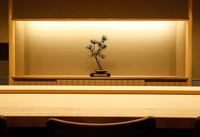 木材や土壁など伝統的な和の素材を使用した空間作りに定評のある建築家・木島徹氏が手がけた店。数寄屋造りのお洒落でモダンな空間には、洗練された和の設えが施され、間接照明のやわらかな明かりのもと、ゆったりと寛ぐ上質なひとときを過ごすことができる。