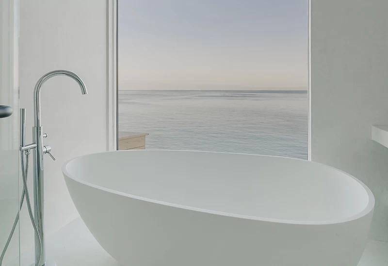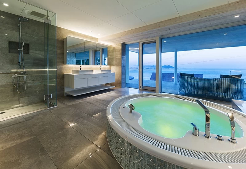 瀬戸内海東部に位置する淡路島の丘の上、豊かな自然に囲まれた一棟貸しの宿「TERROIR」。この宿には「KURA」「F HUT」「S HUT」の3棟があり、いずれの棟もバスタブから海を望む贅沢な設計となっています。特に「KURA」の2階にあるバスルームは、円形の浴槽を中心に配した非日常的なデザインが魅力。窓からは広い海と空が広がる絶景が望めます。広大な自然の中で、五感を研ぎ澄ませながら贅沢なひと時をお過ごしください。