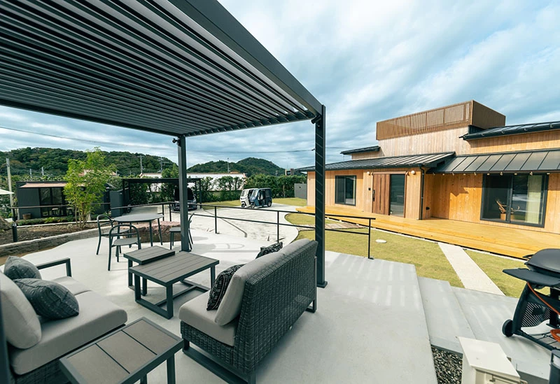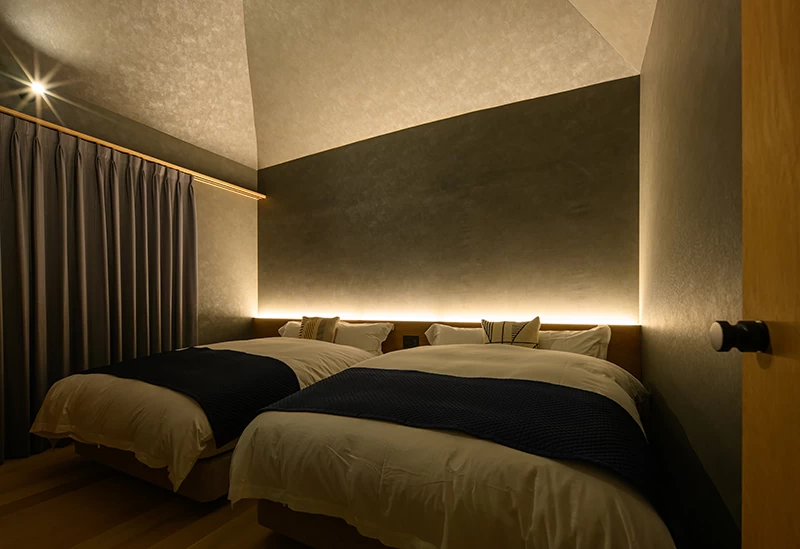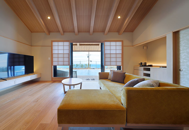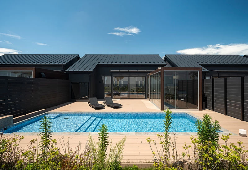 九十九里浜エリアの本須賀海岸にほど近い場所に佇む一棟貸し宿「閑閑舎」。伝統的な寄棟屋根が描く深い陰影と、石と木が調和する直線美が落ち着いた空間を演出します。洋室と和室に加えロフトも備え、グループでもゆとりある滞在が可能です。「East」棟にはサウナルーム、「West」棟には岩盤浴と水素風呂を完備。屋外にはバーベキュー設備やファイヤーピットも設けられています。出張シェフによる料理体験も魅力的です。