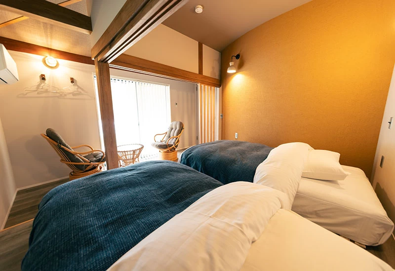 千葉県南房総市富浦町福澤にある一棟貸しのプライベートヴィラ「atsumaro villa minamiboso」は、東京湾アクアライン経由で都心から車約90分、南房総エリアの玄関口に位置し観光の拠点として最適です。海と緑に囲まれ、原岡海岸や岡本桟橋(原岡桟橋)へは車で約5分、。フルリノベーションされた室内には、シングルベッド2台を用意。和モダンな空間が魅力です。敷地内にはバレルサウナもあり、無料で利用可能となっています。