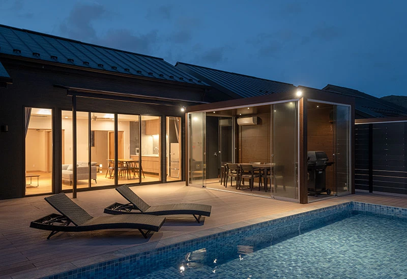 10m×3mの大型プールを備える貸別荘。ヤシの木に囲まれ、夜にはライトアップされるので、南国リゾートホテルの気分を味わいたい方におすすめです。プールサイドでは、フィンランド発祥の樽型サウナ・バレルサウナが楽しめますよ。約185平米の空間には2つのベッドルームに加え、開放的なリビングとカウンターキッチンが備えられています。リビングからプールを眺められるので、大人が部屋で過ごしながら、子どもはプールで遊ぶといった過ごし方もできるでしょう。家族やグループでの団らんや映画鑑賞、料理を作ってのパーティーなど過ごし方は無限大です。
