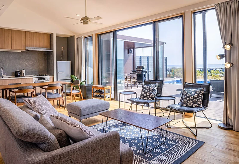 千葉県一宮町、海と緑に囲まれた一棟貸しのプライベートヴィラ。フェンス付きの広い天然芝ガーデンでは、屋根付きバーベキューや夏期のプール遊びが楽しめ、グループやカップルで優雅な休日を過ごせます。客室はコンドミニアム仕様で、キッチンや洗濯機、独立した寝室を完備。別荘のように寛げると好評です。海まで徒歩圏内で温水シャワーもあり、アクティブな滞在にも最適。大型犬も一緒に泊まれる贅沢な空間です。