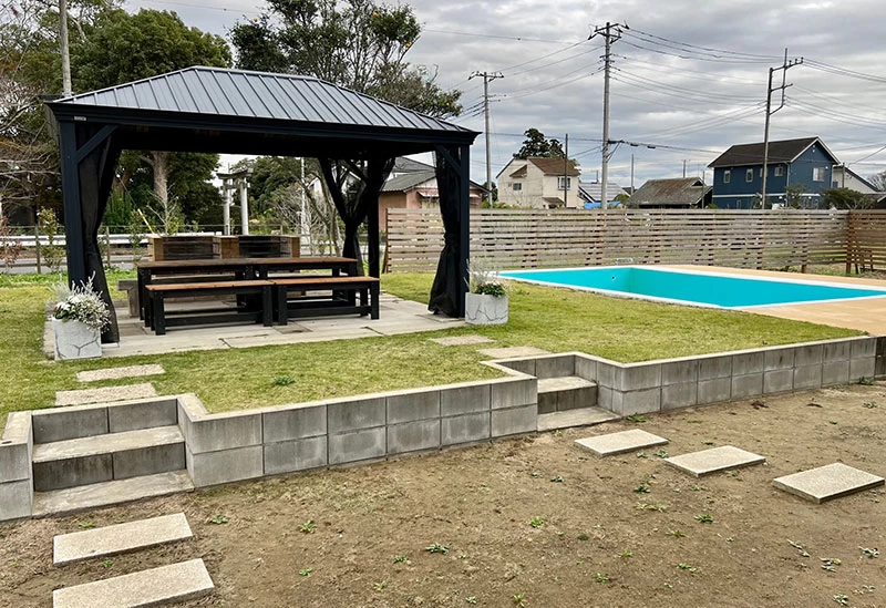 匠のこだわりが随所に感じられる「山武来人 さくらの宿」は、1日1組限定で伝統建築の日本家屋を貸切にできる贅沢な宿です。立派な門構えや趣ある外観は、まさに圧巻の造り。最大12名まで宿泊可能で、親戚の集まりやグループ旅行など幅広いシーンで活用できます。6月下旬から9月頃は4m×6mの大きなプールも開放され、お子様も存分に愉しめます。海も近いですが、施設内のプールで過ごす時間もおすすめですよ。