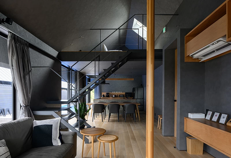 九十九里浜エリアの本須賀海岸にほど近い場所に佇む一棟貸し宿「閑閑舎」。伝統的な寄棟屋根が描く深い陰影と、石と木が調和する直線美が落ち着いた空間を演出します。洋室と和室に加えロフトも備え、グループでもゆとりある滞在が可能です。「East」棟にはサウナルーム、「West」棟には岩盤浴と水素風呂を完備。屋外にはバーベキュー設備やファイヤーピットも設けられています。出張シェフによる料理体験も魅力的です。