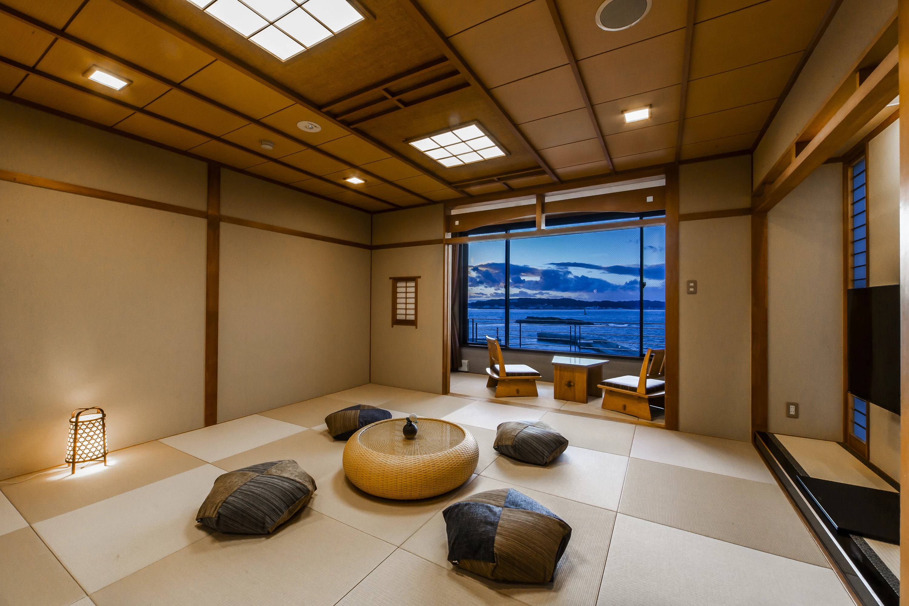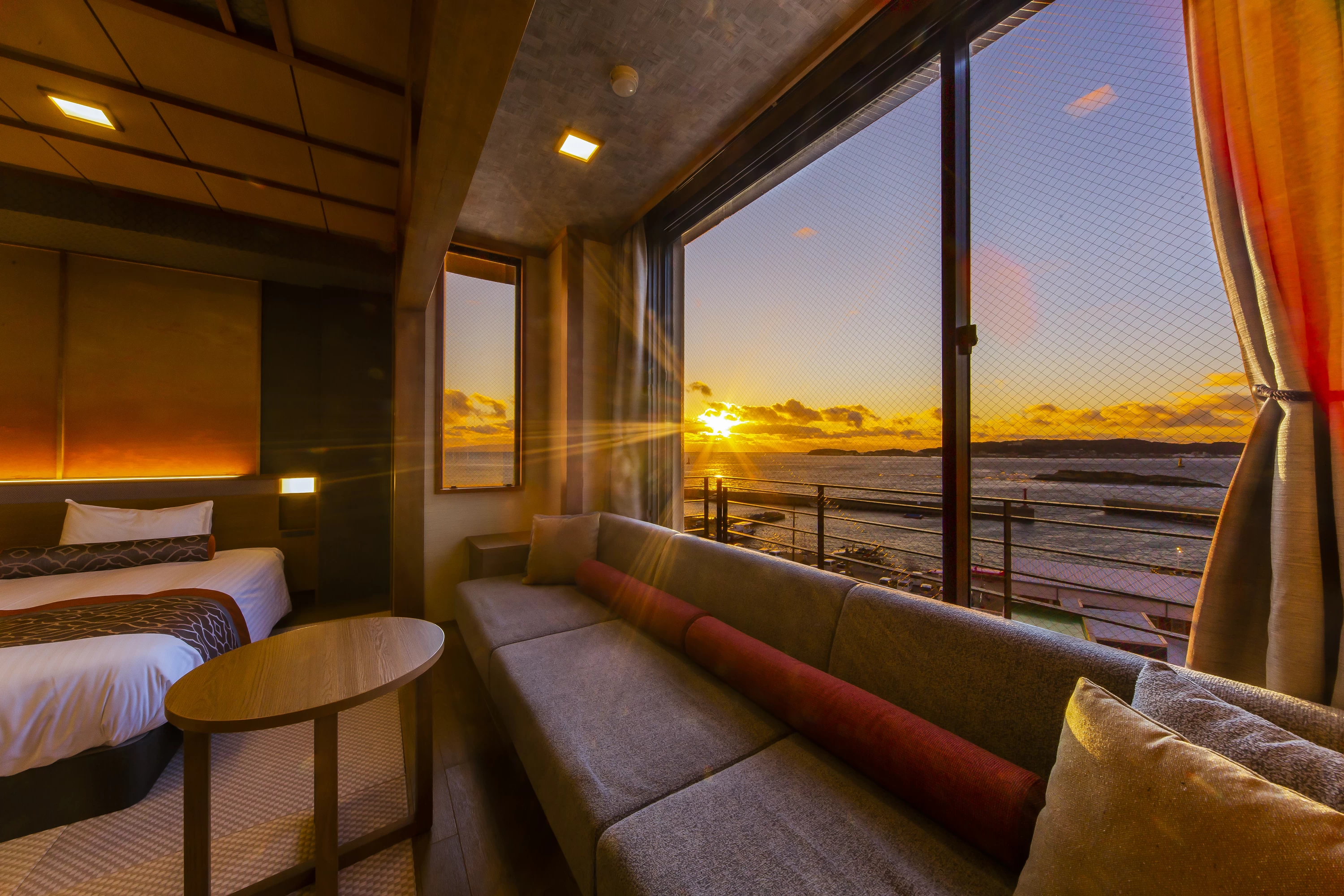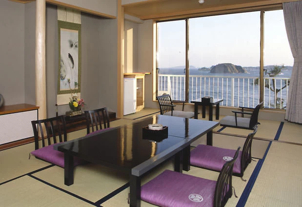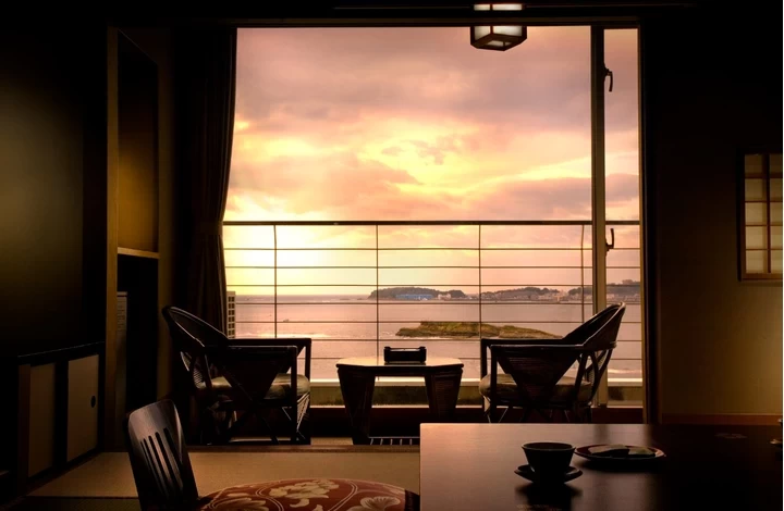 タコやトラフグはもちろん、アワビ、ウニ、アナゴなど新鮮な海の幸が一年を通じて味わえる、日間賀島ならではの宿。調味料まで地元産にこだわった料理は、地酒やワインとのペアリングも一興です。海側の客室や最上階の展望風呂「天海の湯」からは三河湾・伊勢湾を望む大パノラマが楽しめるのも魅力のひとつ。半露天風呂付きや畳敷きにシモンズのベッドを備えた和モダンな部屋など、特別な日の滞在にもぴったりな客室も完備しています。知多半島に沈む夕陽を眺めながら、滞在時間を心ゆくまで楽しみましょう。