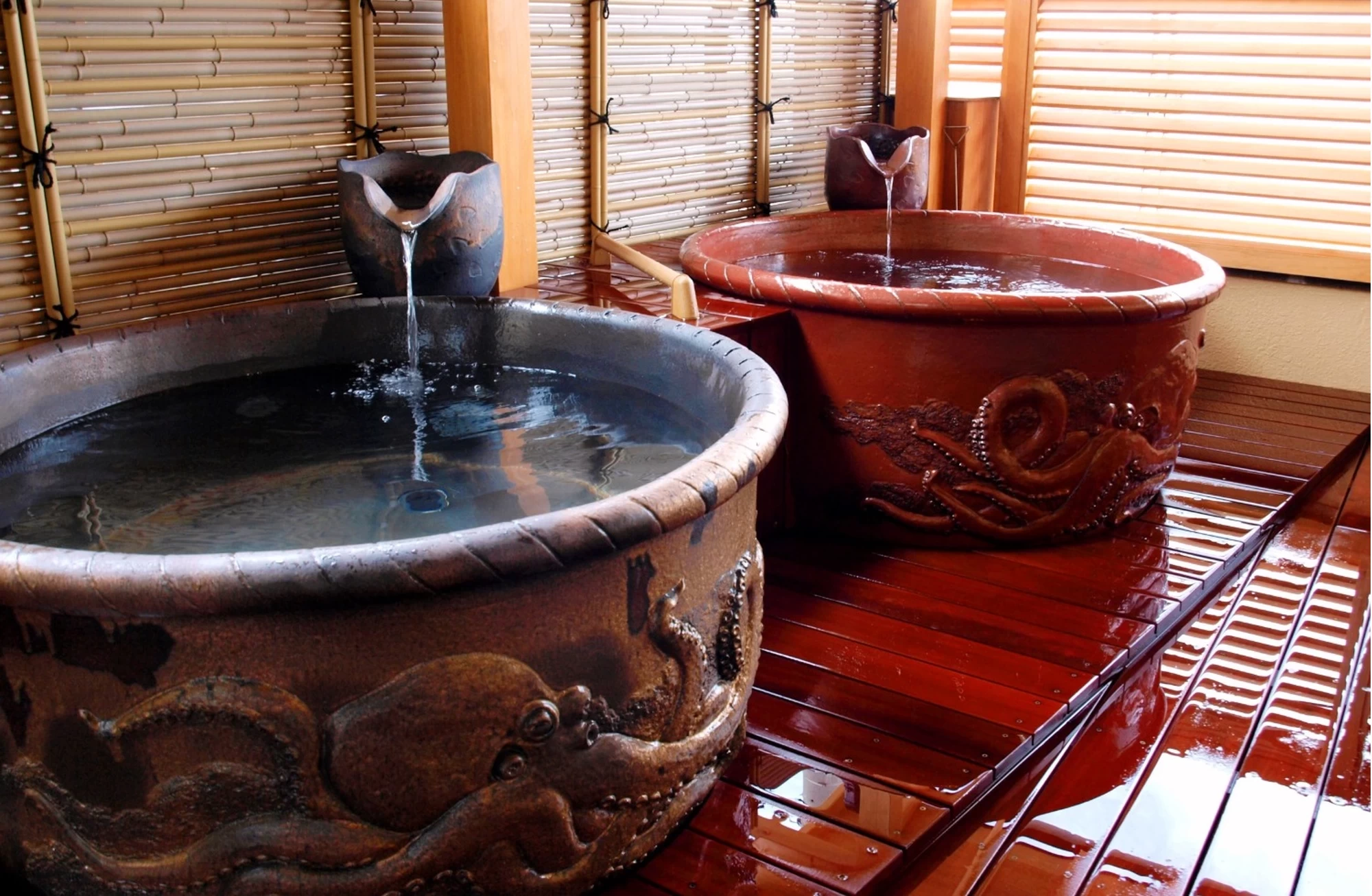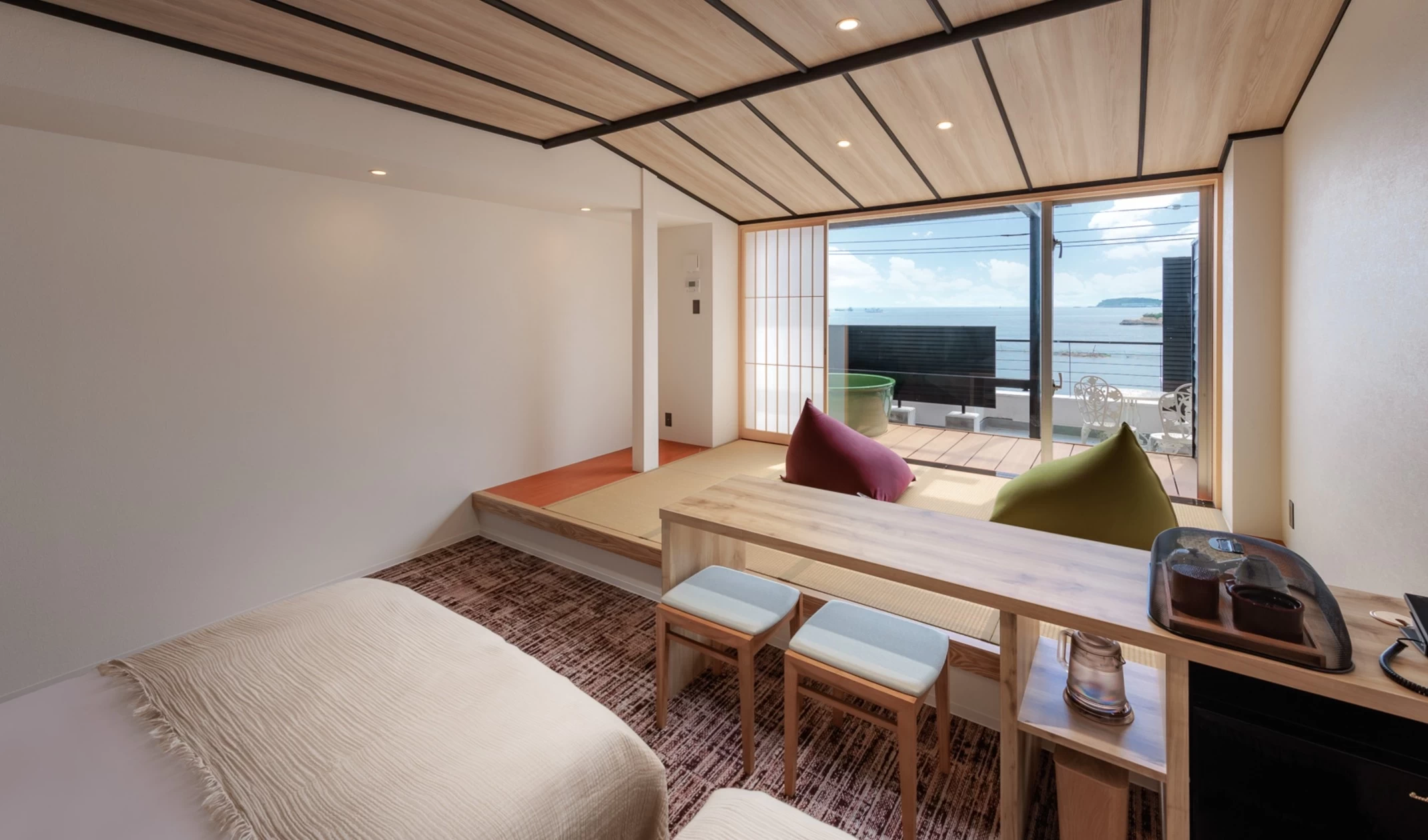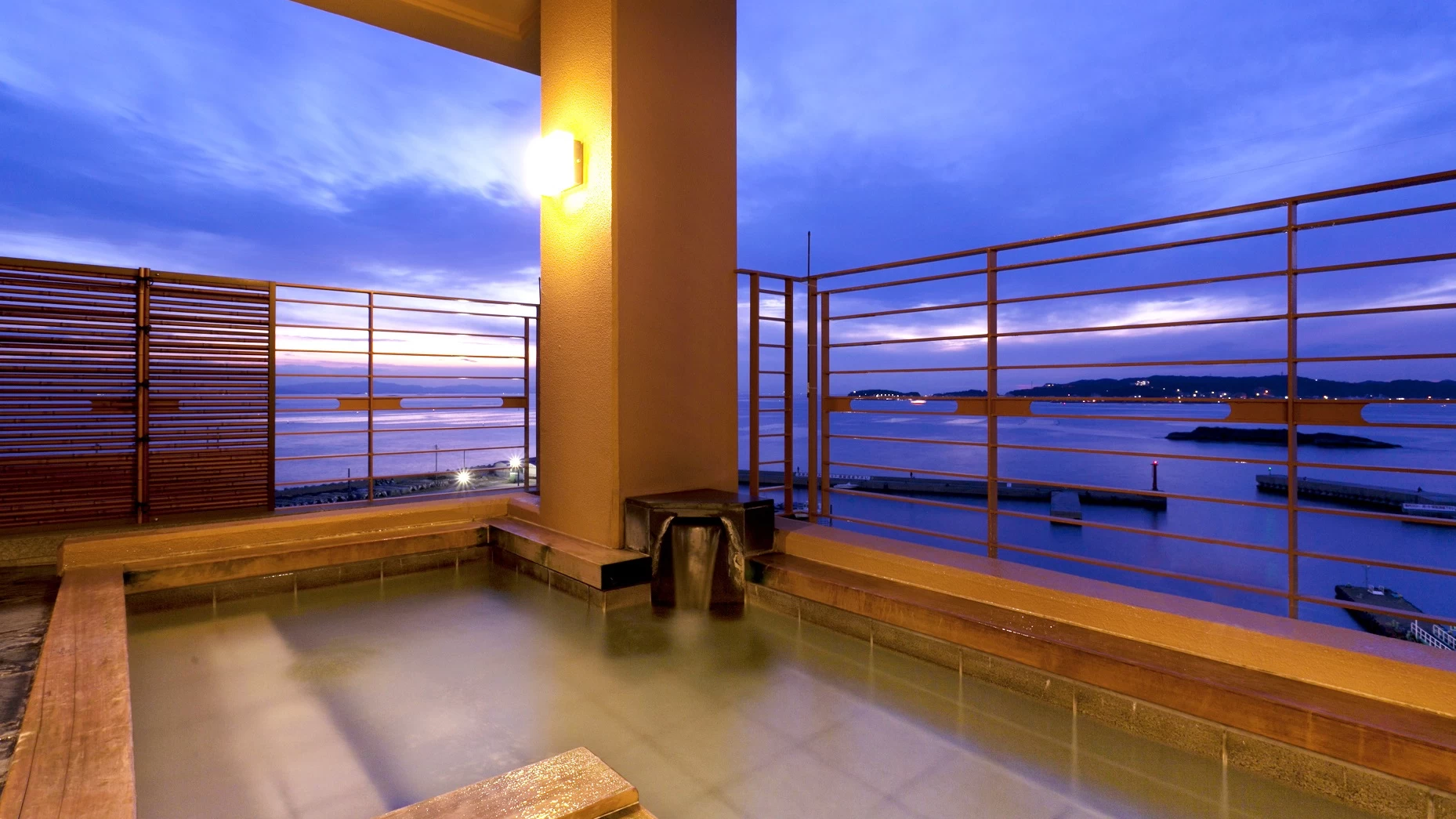 タコやトラフグはもちろん、アワビ、ウニ、アナゴなど新鮮な海の幸が一年を通じて味わえる、日間賀島ならではの宿。調味料まで地元産にこだわった料理は、地酒やワインとのペアリングも一興です。海側の客室や最上階の展望風呂「天海の湯」からは三河湾・伊勢湾を望む大パノラマが楽しめるのも魅力のひとつ。半露天風呂付きや畳敷きにシモンズのベッドを備えた和モダンな部屋など、特別な日の滞在にもぴったりな客室も完備しています。知多半島に沈む夕陽を眺めながら、滞在時間を心ゆくまで楽しみましょう。