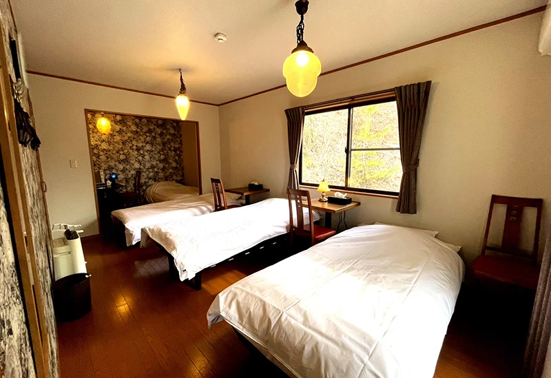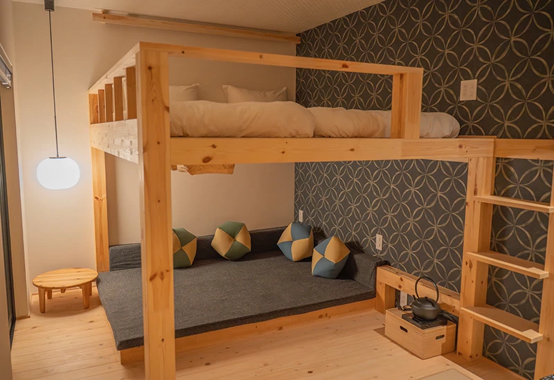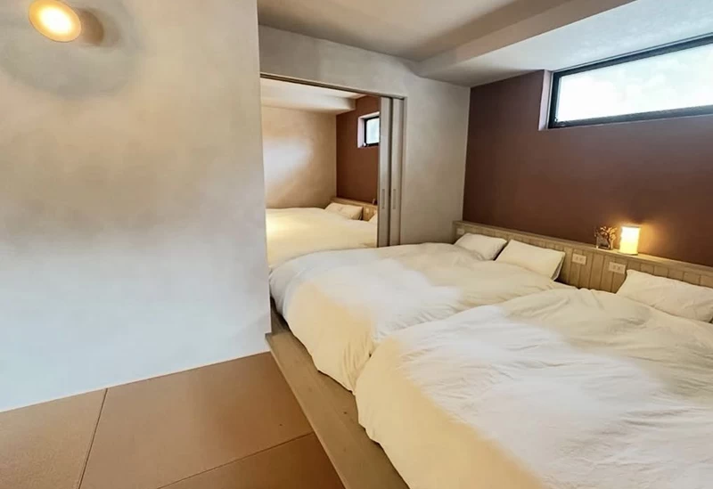 建物にはベッドルームが1室、畳敷きの部屋が2室あり、ダイニングルームとキッチンも完備。最大8名まで宿泊可能なため、家族やグループでの利用にも最適です。