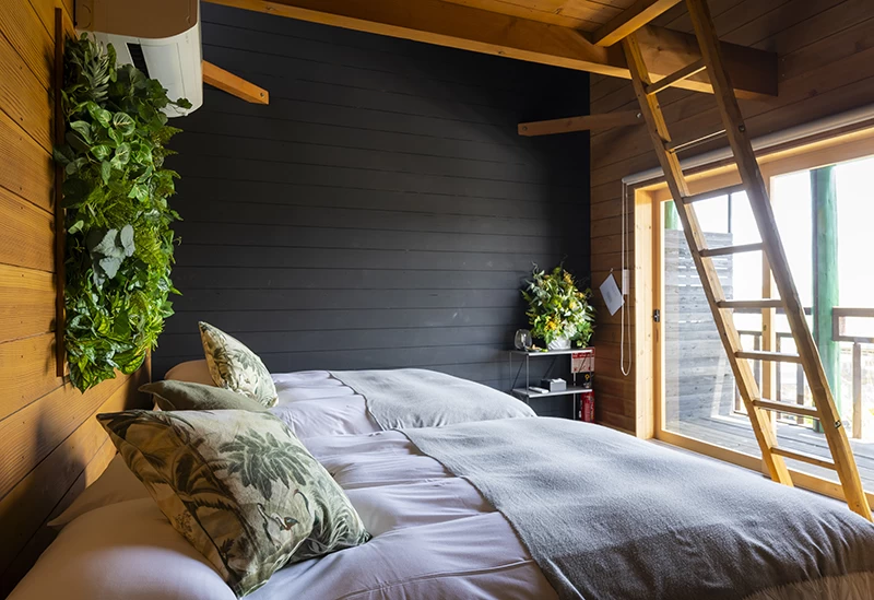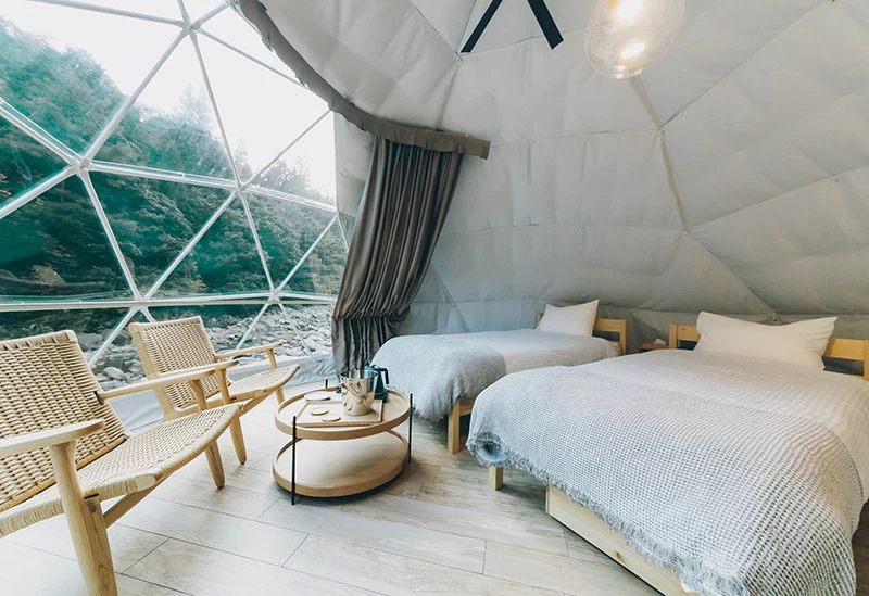 宿泊施設は、エアコン完備でオールシーズン快適に過ごせるコテージ2棟とドーム型テント2棟。11時から14時の間で日帰り利用も可能で、自然の中で優雅なひとときをお過ごしいただけます。