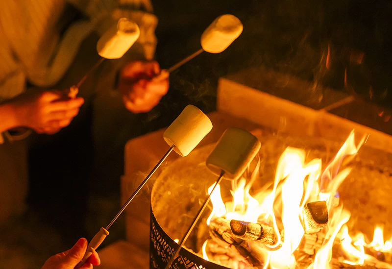「厳選食材のグランピングバーベキュー」プランでは、広島県を代表するブランド和牛の比婆牛(ひばぎゅう)が堪能でき、季節に応じてダッチオーブンや鍋料理も楽しめます。素泊まりプランでは食材を持ち込むこともできるため、地元の市場で調達するのもおすすめ。食事の後は、各テントに備わるたき火台でリラックスしたひとときを過ごすことができます。わからないことがあれば、フレンドリーなスタッフがサポートしてくれるので安心です。