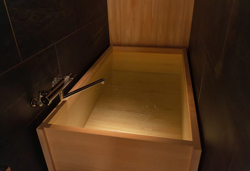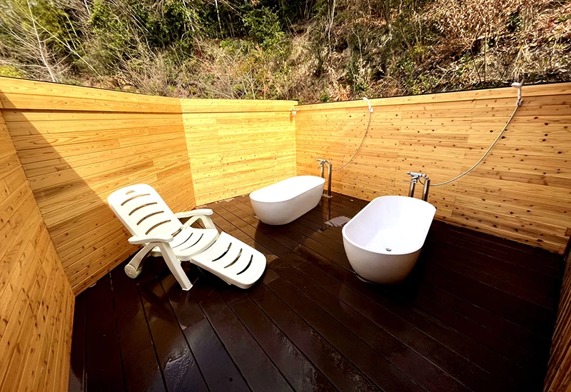 お風呂は、広々とした石造りの内風呂と露天五右衛門風呂の2種類をご用意しています。内風呂は大人4人が入れる広さで、肌触りの良い天然の湯が楽しめます。露天五右衛門風呂では、夜空に輝く星々を眺めながら贅沢なひとときをお楽しみいただけます。
