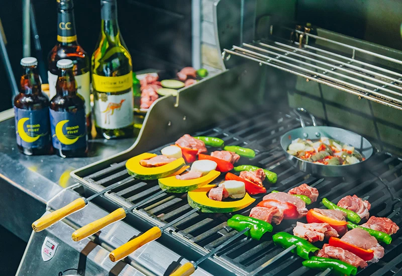 「不老仙」では、手ぶらで愉しめるバーベキューセットをオプションで提供しています。牛肉、豚肉、鶏肉、そして新鮮な野菜数種類に加え、焼き肉のタレも含まれています。必要な道具も全て揃っているため、ガーデンパーティのような雰囲気で、気兼ねなくバーベキューを楽しめます。