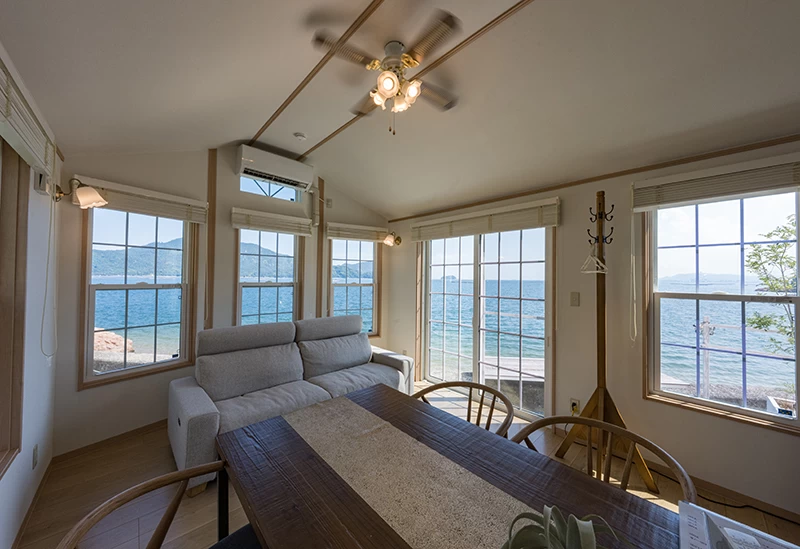 瀬戸内の自然を間近に感じながら、地元食材を使った贅沢なバーベキューや、ワッフルホットサンドの朝食を楽しめます。インフィニティプールや星空の下のサウナ、焚き火やマシュマロ焼きなど、体験メニューも充実。