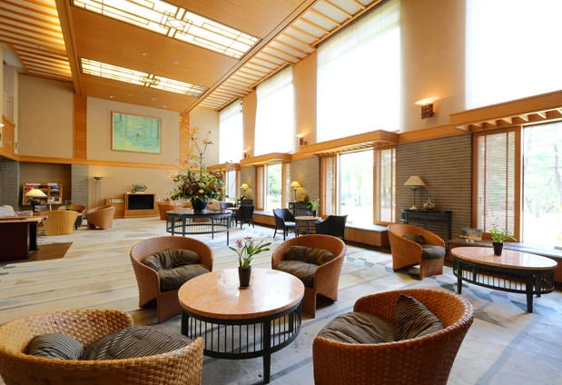 客室によっては、地元の旬食材を使った懐石料理を部屋食でゆっくり味わうことも可能。素足に心地いい一面桐敷きの床が広がるロビーには、ラウンジや読書コーナー、売店などが充実しています。